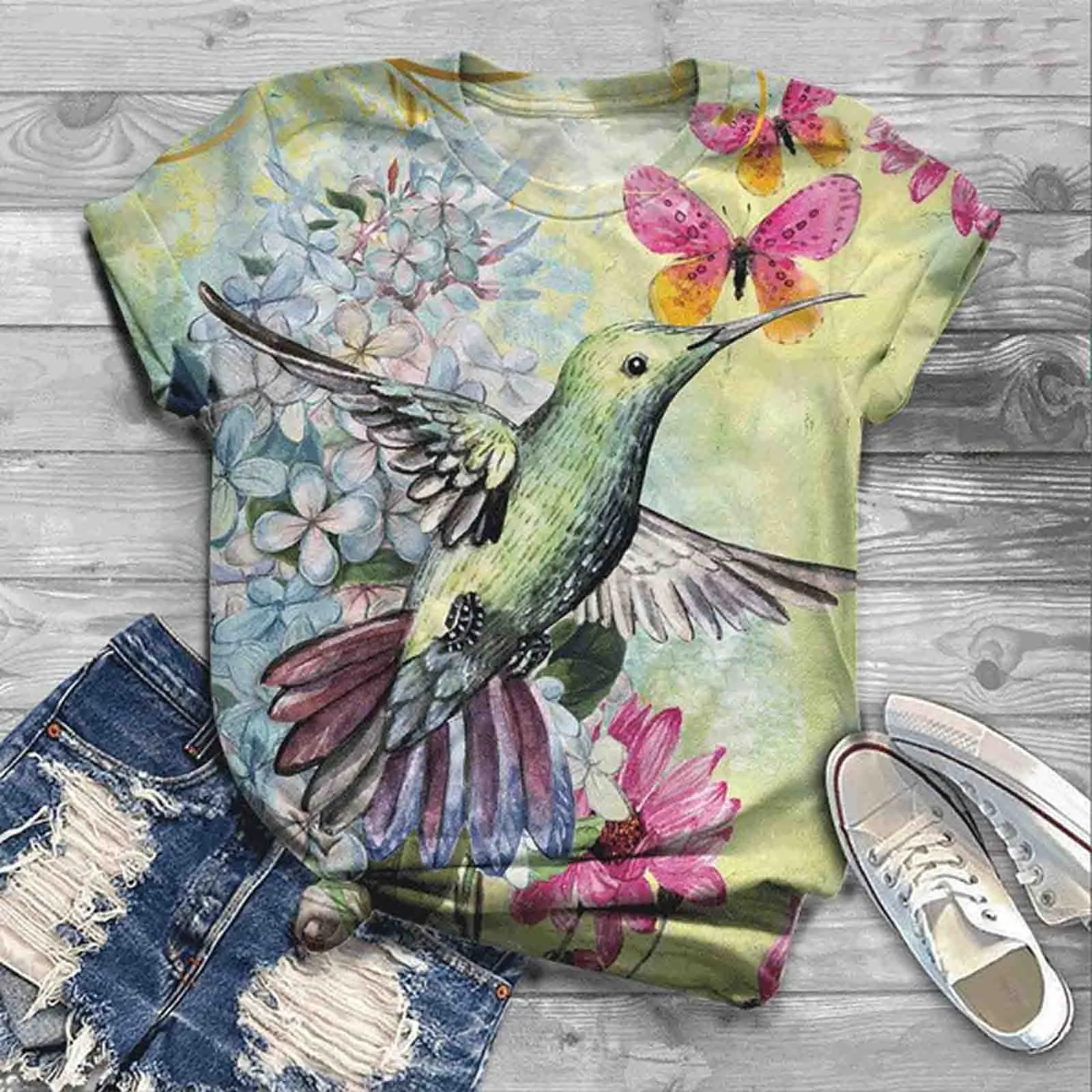 Женские футболки в стиле Харадзюку, летние женские футболки с коротким рукавом и принтом птиц, топы с круглым вырезом, футболка, женские футболки