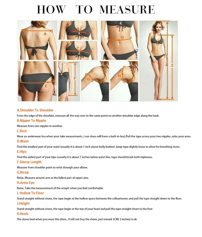 Наша команда может адаптировать образец платья в соответствии с вашими измерениями. Если вам нужно, чтобы мы сделали более совершенное свадебное платье для вас в соответствии с вашими данными измерений, пожалуйста, выберите любой размер, чтобы отправить заказ сначала, после оплаты, пожалуйста, отправьте мне данные измерений в течение трех дней. Пожалуйста, измерьте согласно нашим требованиям. Мы рекомендуем Вам обратиться к вашей семье, чтобы помочь вам с вашими измерениями. Вы также можете найти профессионального местного портного, который поможет вам точно измерить. Здесь мы покажем вам, какие измерения необходимы и как их правильно сделать.