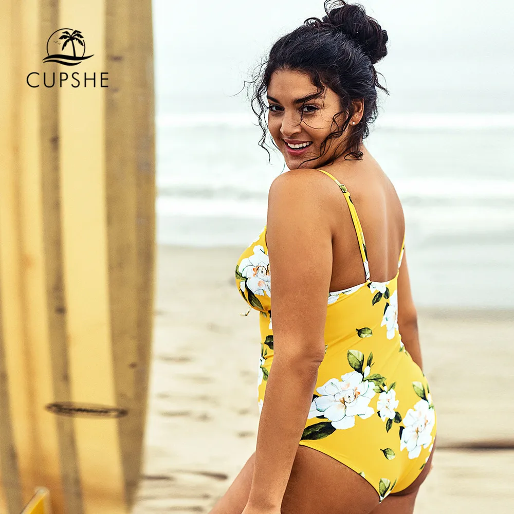 CUPSHE купальник размера плюс на шнуровке с желтым цветочным принтом, Цельный купальник для женщин, большой размер 4XL, монокини, купальные костюмы, 2022, пляжный купальник