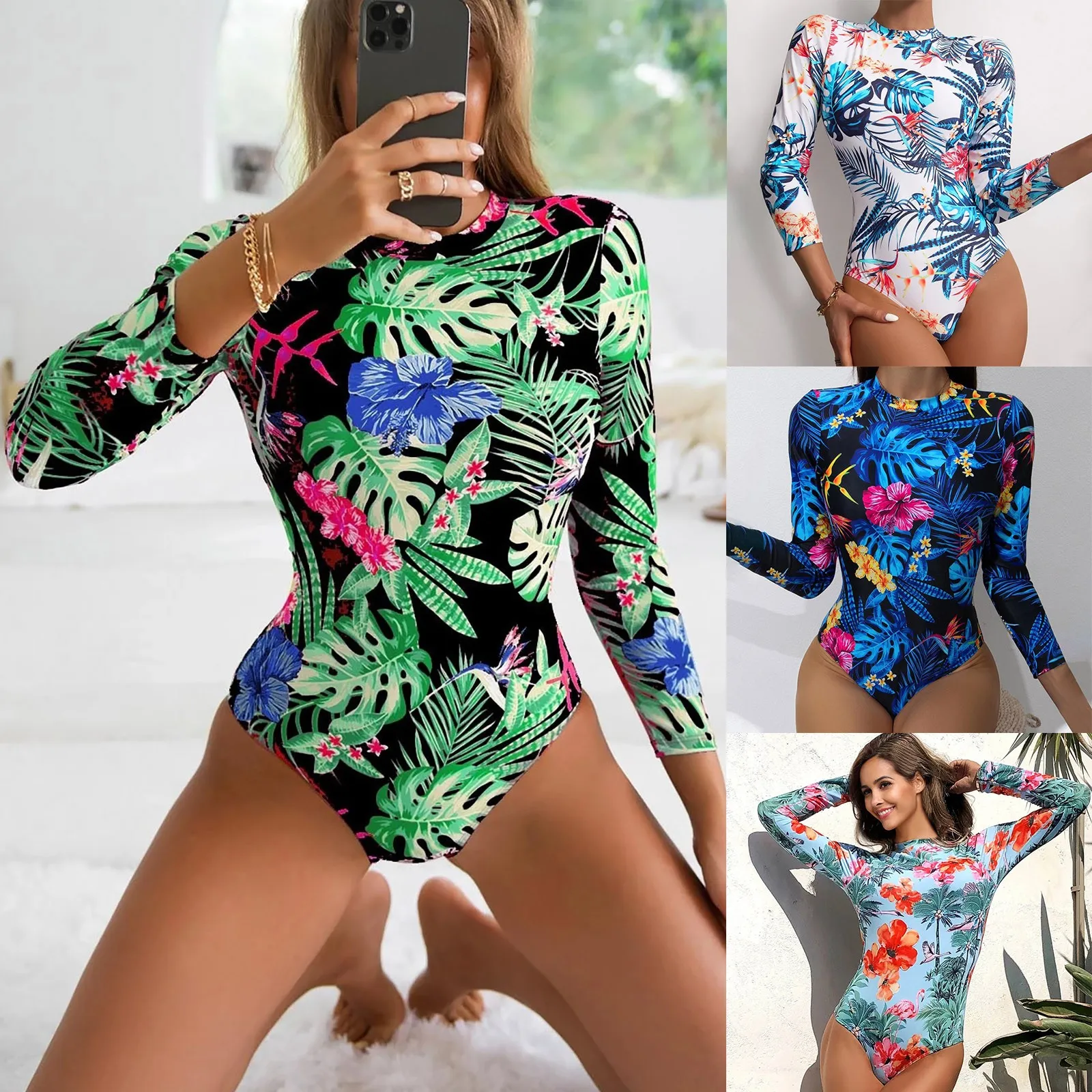 Слитный купальник с цветочным принтом, женский купальник, монокини с длинным рукавом, женский купальный костюм с принтом, женская одежда для плавания, пляжная одежда