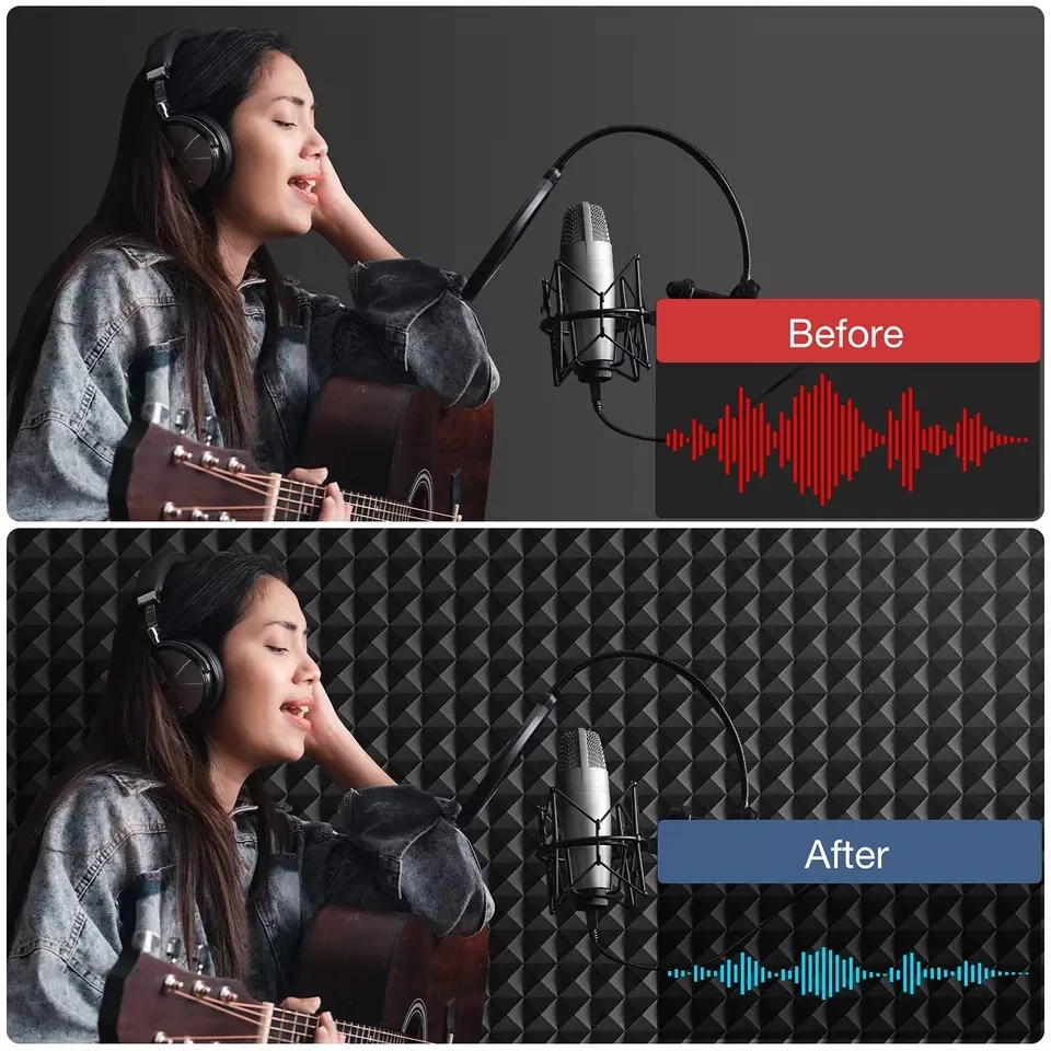 1. Акустическая структура пены высокой плотности для максимального поглощения шума.2. Помогает трепетать эхо и уменьшать излишки отражений и реверберации.3. Улучшает четкость вокала и акустику вашей комнаты.4. Устойчивость к деформации, длительный срок службы, простота установки.5. Огнестойкий, влагостойкий и дышащий.