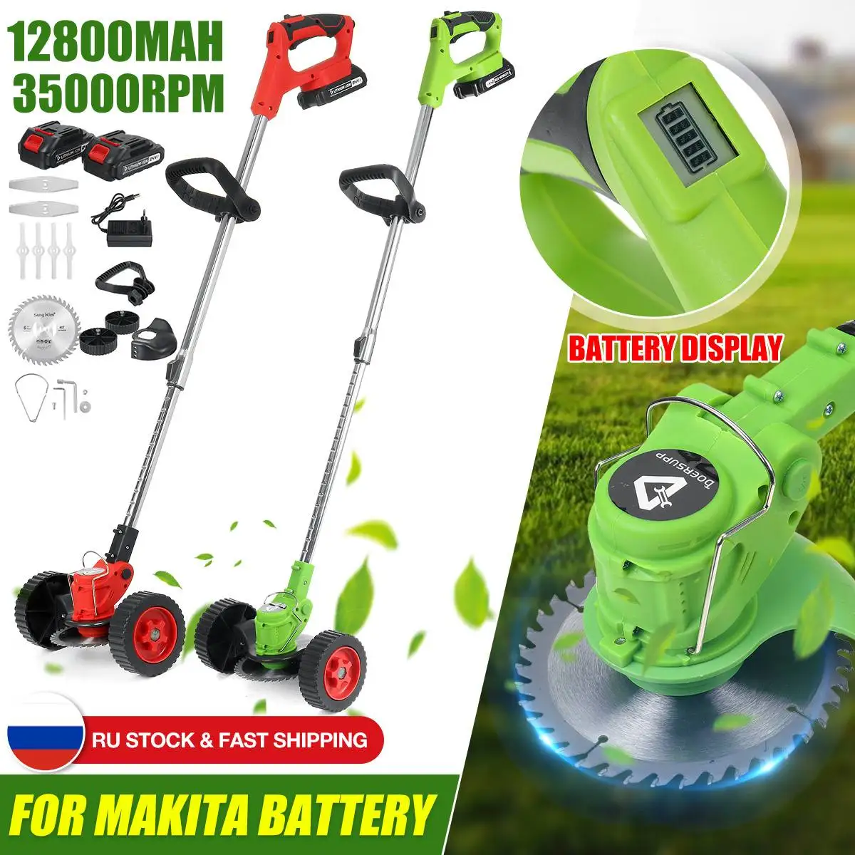 Особенности:-Двигатель из чистой меди, высокая мощность, быстрая скорость.-Провод для предотвращения столкновений, лезвие защитной рамы никогда не прикасается к твердым предметам.-Регулируемая головка машины, без мертвого угла.-Водонепроницаемый Чехол, не легко просачиваться в дождь или розу во время использования.-Диаметр резки, диаметр резки до 150 мм, высокая эффективность.-Удобная вспомогательная ручка, удобная ручка, без ручного трения, положение можно регулировать по желанию.-Двойное переднее колесо, более удобное для работы в течение длительного времени.-Двойная ручка переключателя управления, более удобная работа, высокий коэффициент безопасности.-Светодиодный дисплей батареи, легко понять оставшуюся емкость аккумулятора и контролировать нагрузку.-16-раздел полюс может быть отрегулировано по своему желанию, со степенью расширения 1-36 см, а высота может быть отрегулировано по своему желанию в соответствии с потребностями.Спецификация:-Цвет: красный-Материал: АБС-пластик + алюминий + сталь-Время без нагрузки: около 2-3 часов-Мощность: 1800 Вт-Напряжение: 21(88VF)-Емкость аккумулятора: 12800 мАч-Количество батарей: 2 шт.-Время зарядки: 2-3 часа-Скорость без нагрузки: 35000 об/мин (макс.)-Диаметр резки: 150 мм (макс.)-Телескопическая Конструкция: 93-125 см/36,6-49,2 дюйма-Размер: 30x12x12 5 см/11.8x4.7x49.2''-Аккумулятор: подходит для аккумулятора Makita
