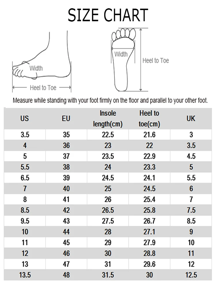 Важное примечание по размерам: Пожалуйста, ориентируйтесь на длину вашей стопы или европейский размер, чтобы выбрать американский размер! Поэтому вам нужно только точно измерить длину стопы, а затем свериться с таблицей размеров, чтобы выбрать правильный размер.