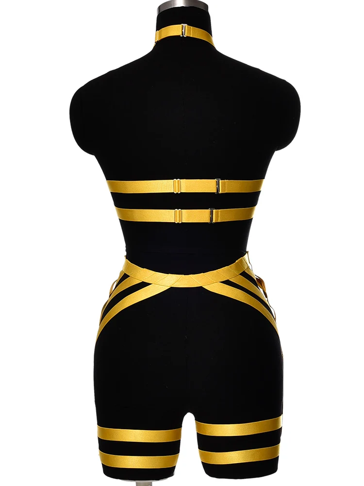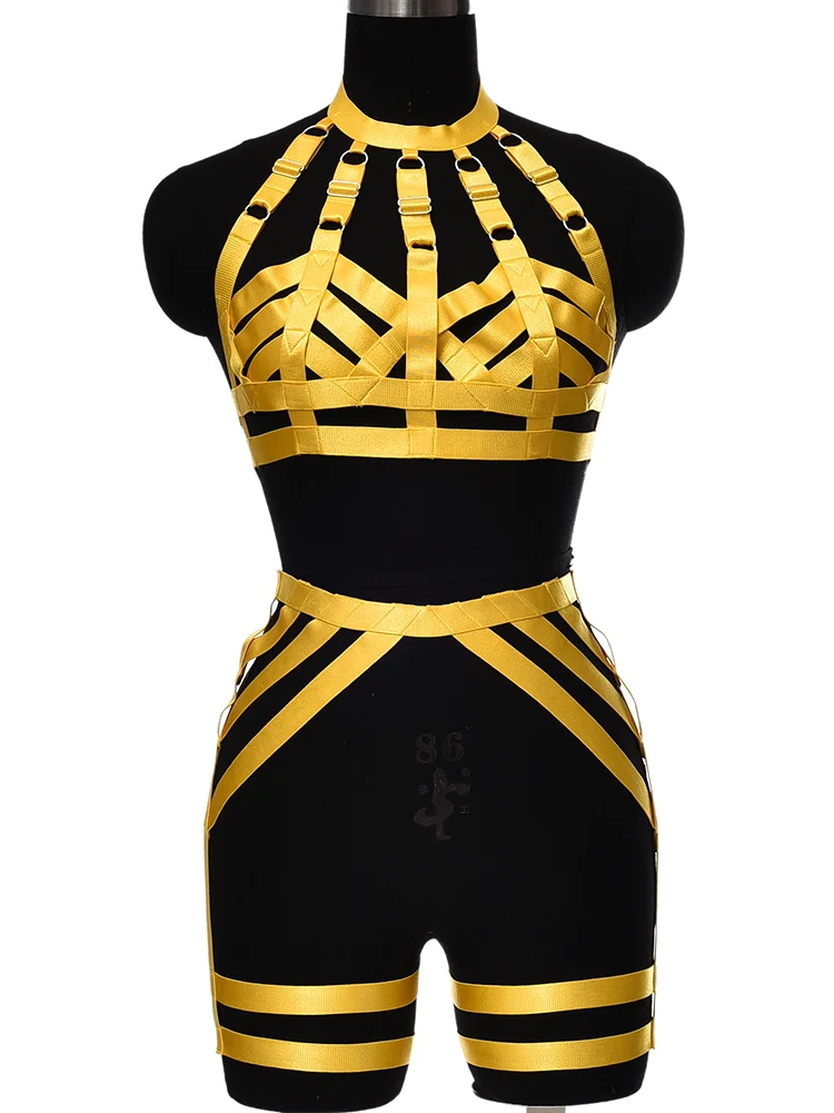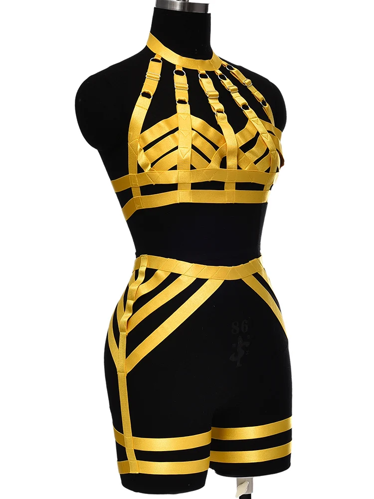 Комплект Фетиш бюстгальтера на бретельках, желтое нижнее белье, ремни, с вырезами, треугольная оправа, бондаж, топ, Женский танцевальный бюстье, подвязка для чулок