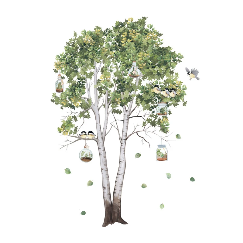 Наклейки на стену с изображением большого дерева, березы, зеленых листьев, растений, настенные наклейки для гостиной, спальни, птиц, домашний декор, декоративные обои из ПВХ для комнаты