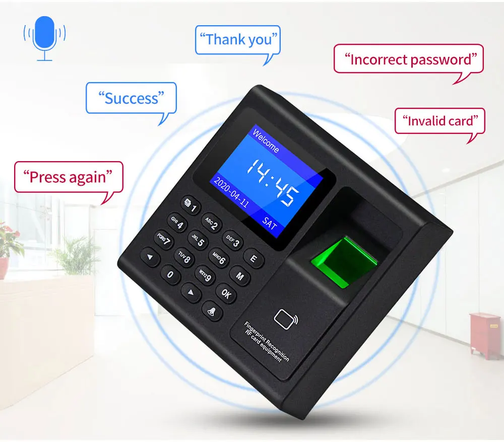С этим рекордером времени отпечатков пальцев, вы можете иметь ваш персонал проверить с помощью отпечатков пальцев, RFID карты и пароль. Поддержка 1000 Емкость пользователя, 1000 отпечатков пальцев, 1000 паролей, 1000 шт RFID карт, 100000 время посещаемости записи.