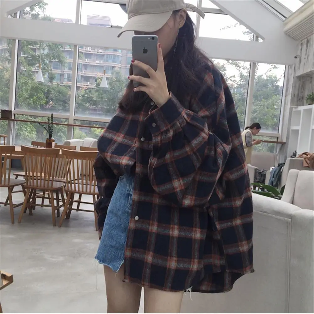 Женская Весенняя уличная блузка Рубашки винтажная клетчатая фланелевая Туника бойфренда рубашка для женщин повседневные корейские Топы