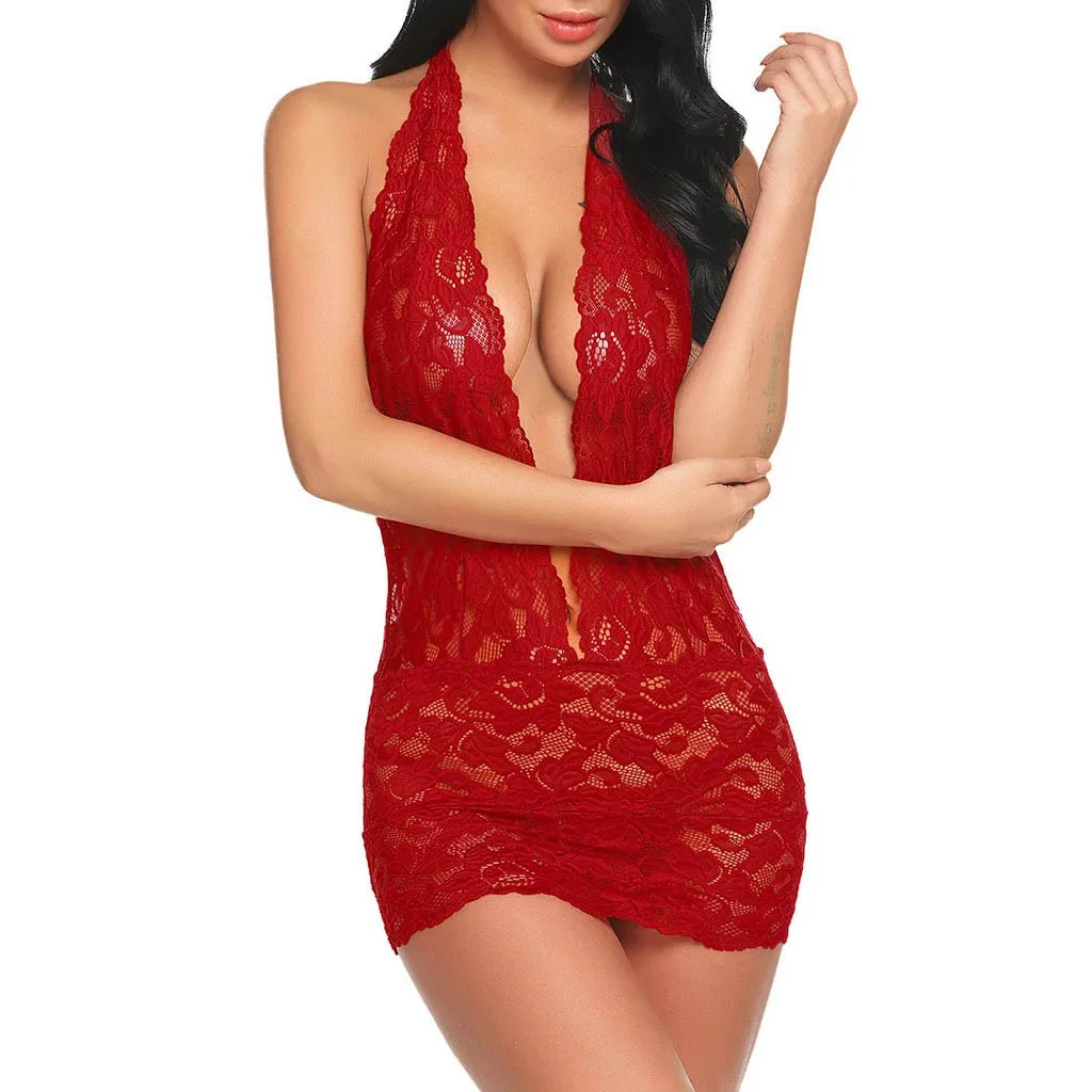 Женское сексуальное кружевное нижнее белье с лямкой на шее, облегающее нижнее белье с открытой спиной и глубоким V-образным вырезом, сексуальная эротическая мини-ночная рубашка, комбинация