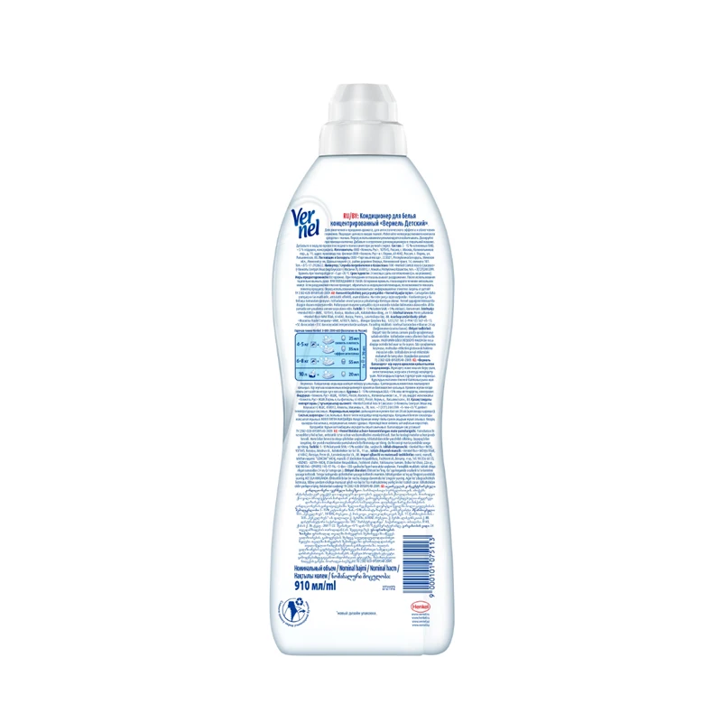 "Концентрированный кондиционер для белья Vernel Детский 910 мл, 30 стирок предназначен для стирки детского белья, а также одежды людей с чувствительной кожей и склонных к аллергии.