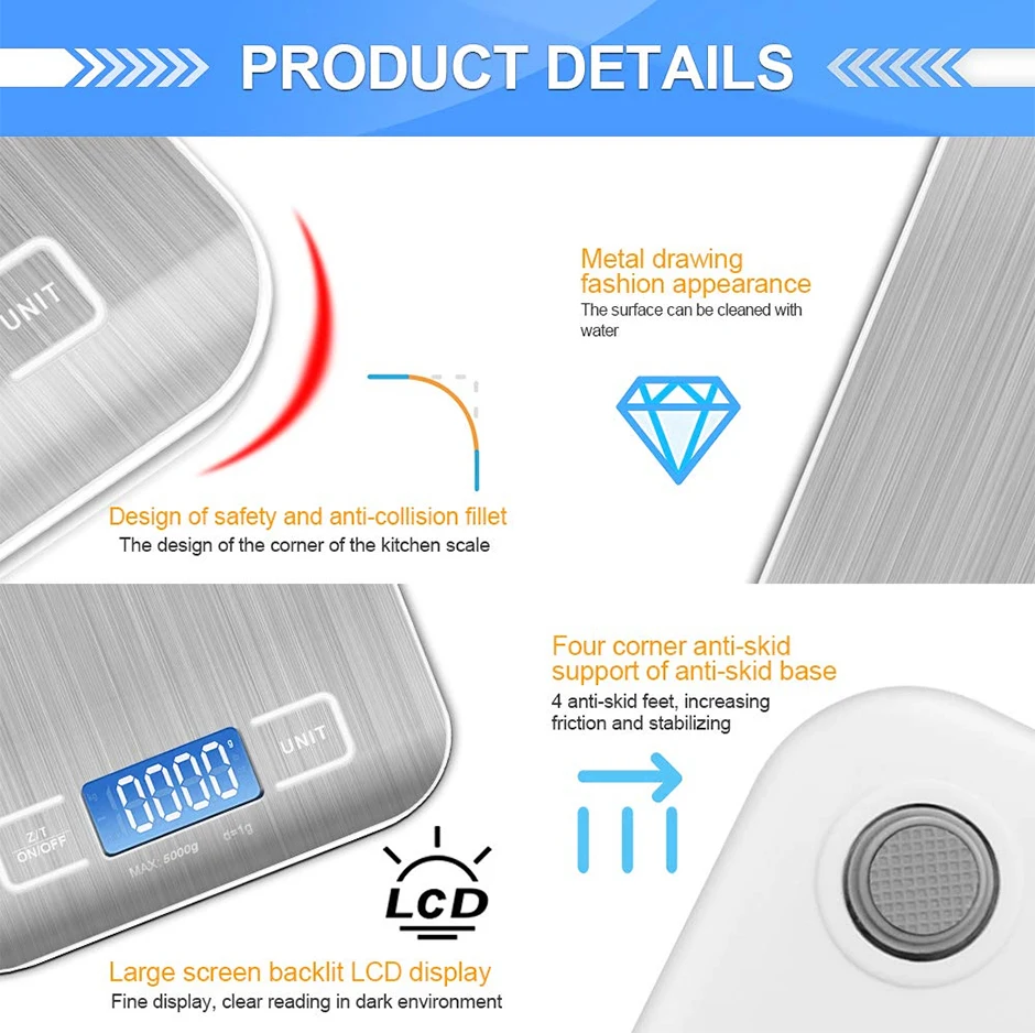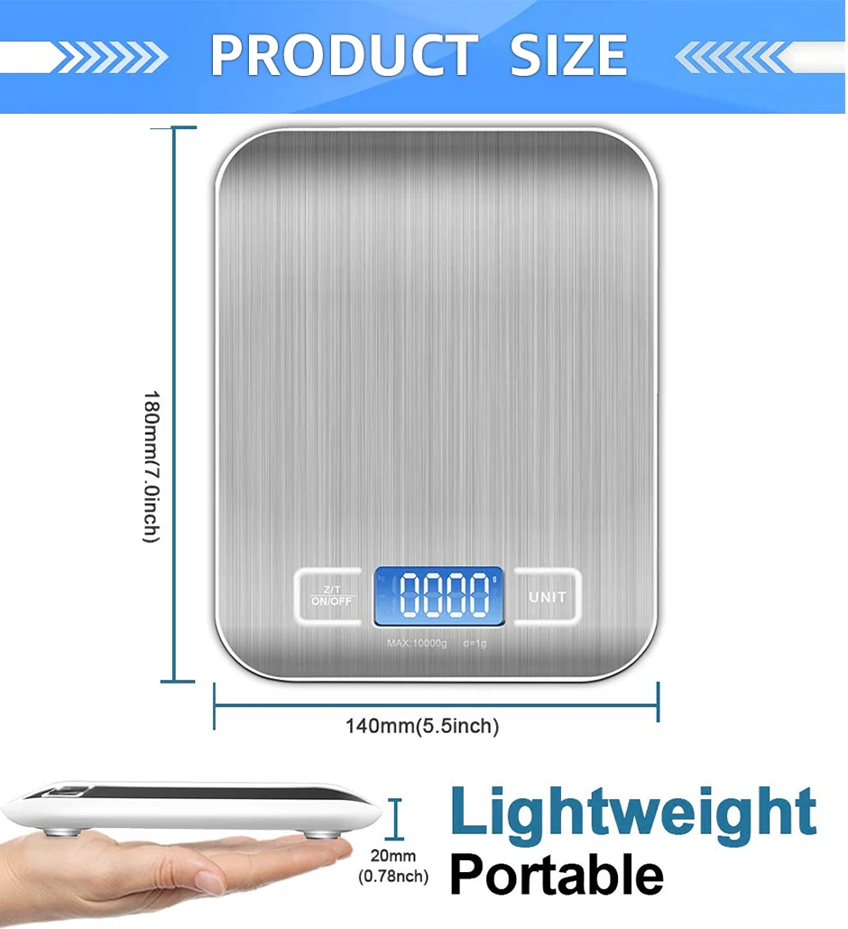 -Емкость: стиль 1 :10000 г/1 г -Единицы измерения: g, lb, ml, oz -Дисплей: ЖК-дисплей с белой подсветкой -Нержавеющая сталь с защитой от отпечатков пальцев -Автоматическое отслеживание нулевой точки -Автоматическое выключение -Подсказка о перегрузке: когда этот знак появляется во время взвешивания, это означает, что текущая нагрузка превышает максимальный вес. -Блок-переключатель преобразования: он может быть преобразован взаимно нажатием кнопки блока. -Высокоточный датчик -Источник питания: 2 аккумулятора AAA (не входят в комплект)