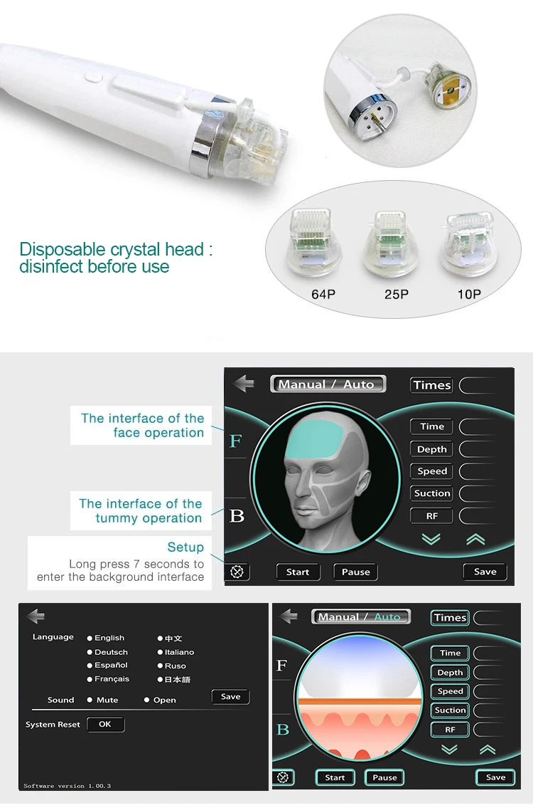 RF Микрокристаллическая головка целевой глубины и потребности в энергии, может быть тонкой регулировкой. RF удаление морщин, активация регенерации коллагена, безопасный и надежный эффект id очевидный