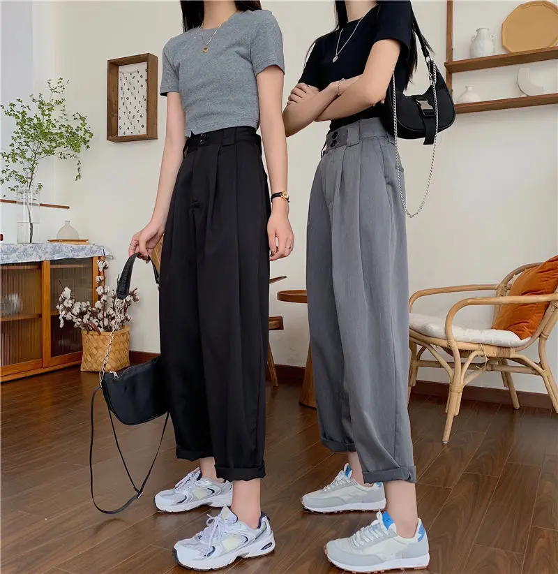 Брюки женские, с высокой талией, однотонные, широкие, в Корейском с...
