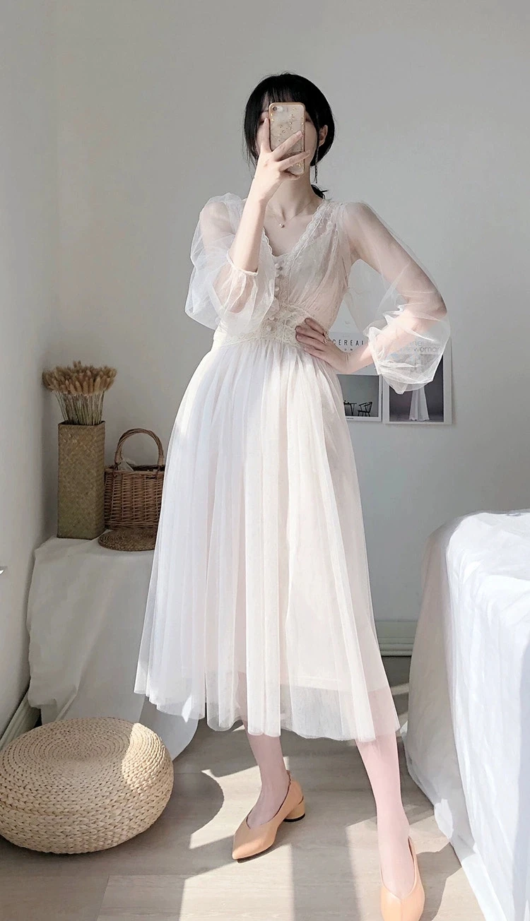 Женское платье 2021 весеннего размера плюс элегантное ТРАПЕЦИЕВИДНОЕ ПЛАТЬЕ Vestidos solidpuffsleeempirev-NeckLadiesLaceDressMesh