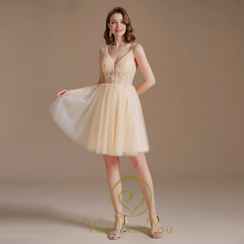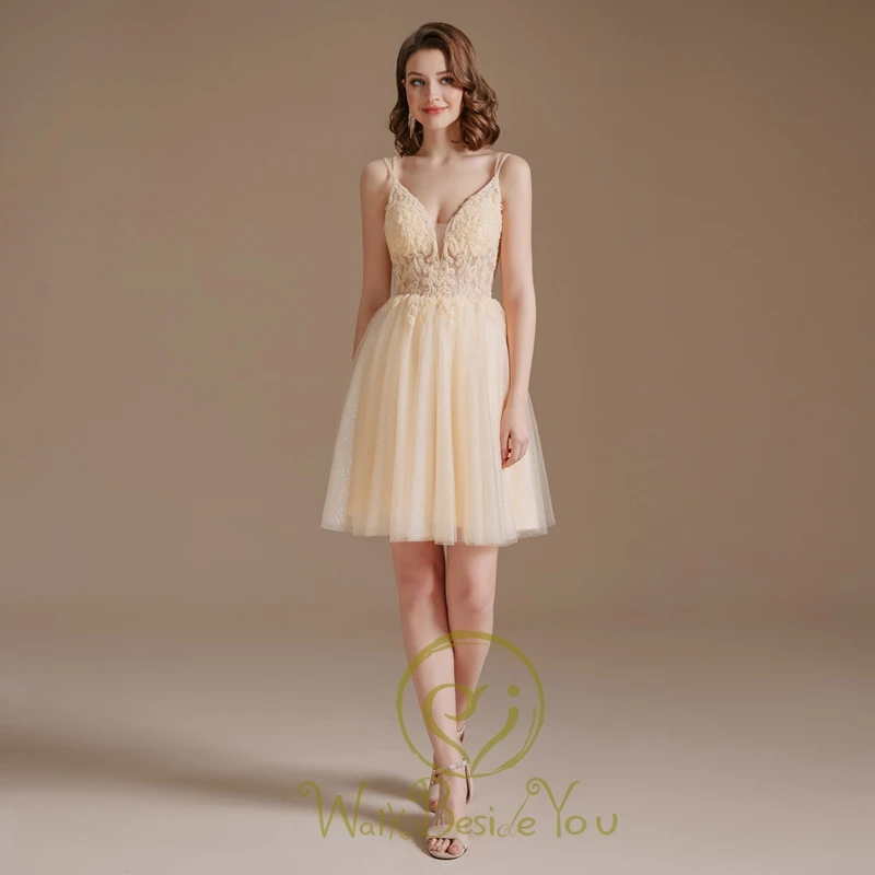Женское короткое вечернее платье, сверкающее Тюлевое мини-платье с глубоким V-образным вырезом и кружевной аппликацией из бисера, трапециевидной формы на бретелях для выпускного вечера, 2022