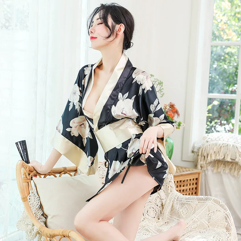 Женский пикантный халат в традиционном японском стиле с цветочным п...