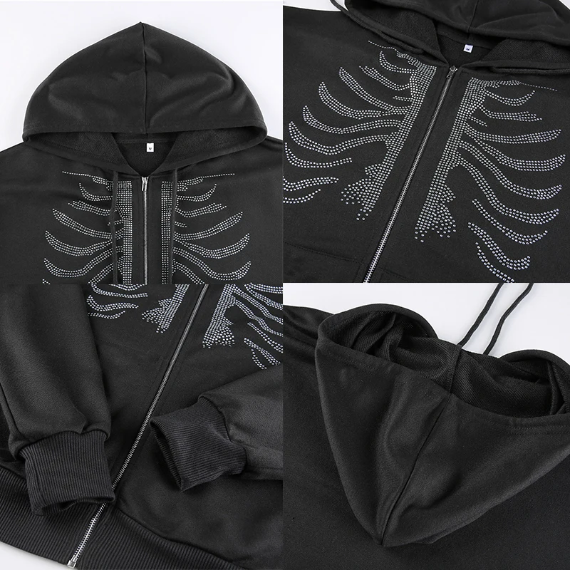 Женские толстовки на молнии Y2K Стразы со скелетом, летние худи в готическом стиле, Женская куртка с капюшоном, уличная одежда в стиле ретро, 2021