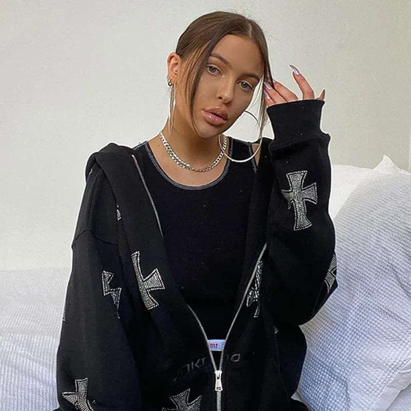 Y2K Стразы толстовки женские хип-хоп оверсайз Готическая молния с д...