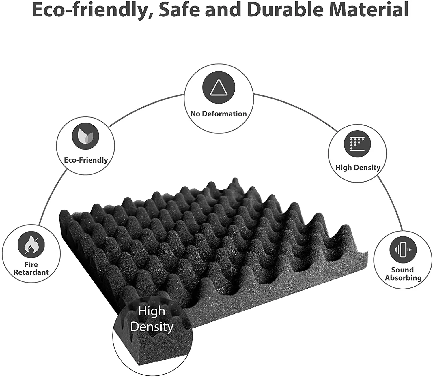 1. Акустическая структура пены высокой плотности для максимального поглощения шума.2. Помогает трепетать эхо и уменьшать излишки отражений и реверберации.3. Улучшает четкость вокала и акустику вашей комнаты.4. Устойчивость к деформации, длительный срок службы, простота установки.5. Огнестойкий, влагостойкий и дышащий.