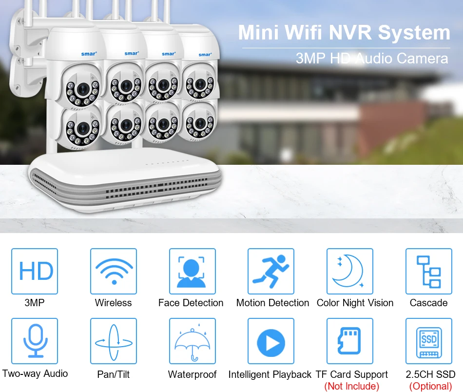 Беспроводная система видеонаблюдения Smar, H.265, 3 Мп, HD, двухстороннее аудио, водонепроницаемая IP-камера PTZ, Wi-Fi, 8 каналов, NVR, комплект видеонаблюдения ICsee