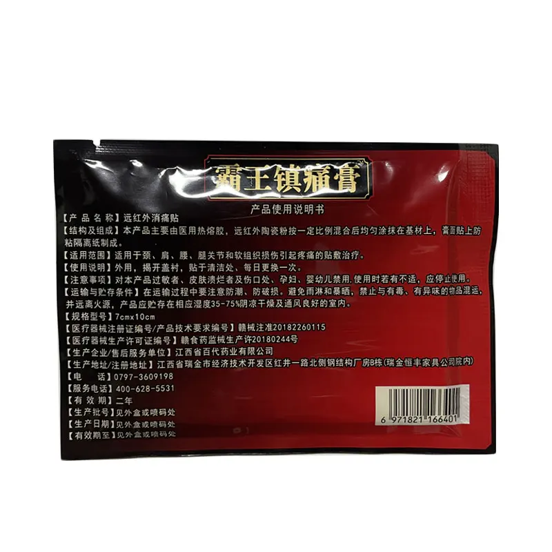 Название продукта:Медицинский пластырь для телаОсновные ингредиенты:100% травянойСрок годности:2 годаРазмер:7*10 смПосылка:8 шт. = 1 сумка (8 шт. в сумке)40 шт. = 5 сумок (8 шт. в сумке)Funtion:Он оказывает хороший терапевтический эффект на различные типы шейных, поясничных и суставных дискомфорта и болиКак использовать:Внимание:Перед использованием этого продукта очистите волосы от желаемой части, чтобы избежать проблем с удалением пластырей после использования1. Чистый и сухой пораженный участок2. Снимите пластиковую подложку с одной стороны патча.3. Гладьте ту сторону над областью, где вы хотите облегчить боль.4. Когда вы удалите другую половину пластиковой подложки, сгладьте оставшуюся часть пластырей над областью боли.5. Снимите пленку и нанесите.6. Рекомендуется, чтобы один патч был предпочтительно 6-8 часов в день, 2-3 раза в день.Прекратите использование и обратитесь к врачу, если:1. Условия ухудшаются2. Признаки остаются более 5 дней.3. Развивается сыпь, зуд или чрезмерное раздражение кожи.4. Если беременна или кормит грудью, перед использованием обратитесь к специалисту здравоохранения.Введение в штукатурку:Штукатурка является важной частью китайской медицины и одной из пяти основных форм фармацевтической дозировки. Штукатурка растворяет или смешивает лекарство с полутвердой пастой и распределяет его на подложке для наружного использования на коже. Гипсовая терапия-это вид внешней терапии. Применяется на внешней стороне тела пациента и использует каналы меридианов для осуществления различных функций, чтобы достичь определенной терапевтической цели.