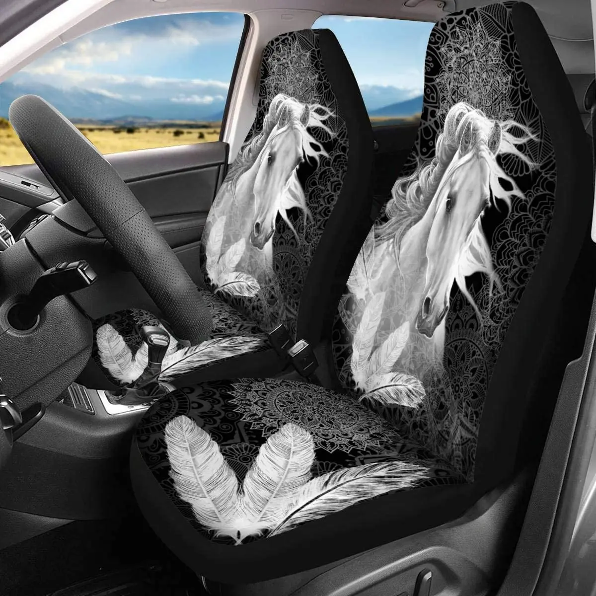 Набор чехлов для автомобильных сидений, универсальные накидки с принтом белых лошадей, мандалы, перьев, для автомобилей, внедорожников, грузовиков