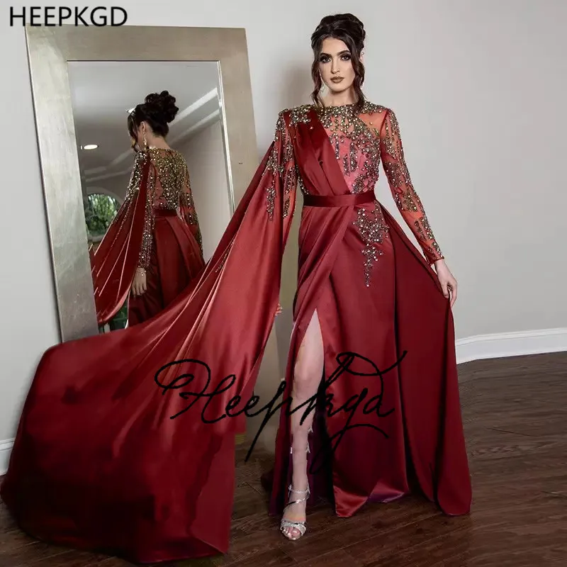 Темно-красное арабское вечернее платье, Длинная накидка, прозрачные шикарные бусины, тюлевые атласные официальные платья для свадебной вечеринки, платье для вечеринки