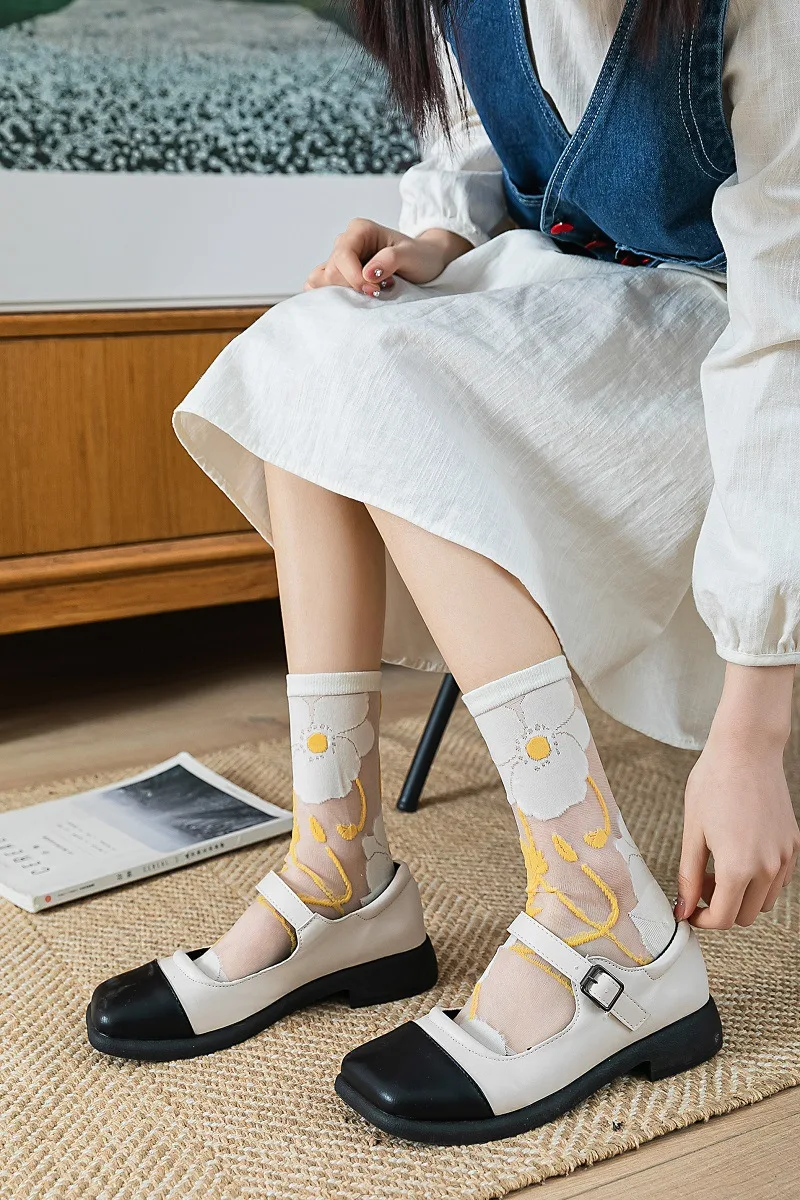 Летние ультратонкие шелковые носки с кристаллами, милые японские кавайные носки с цветочной вышивкой, женские сетчатые прозрачные короткие носки в стиле ретро