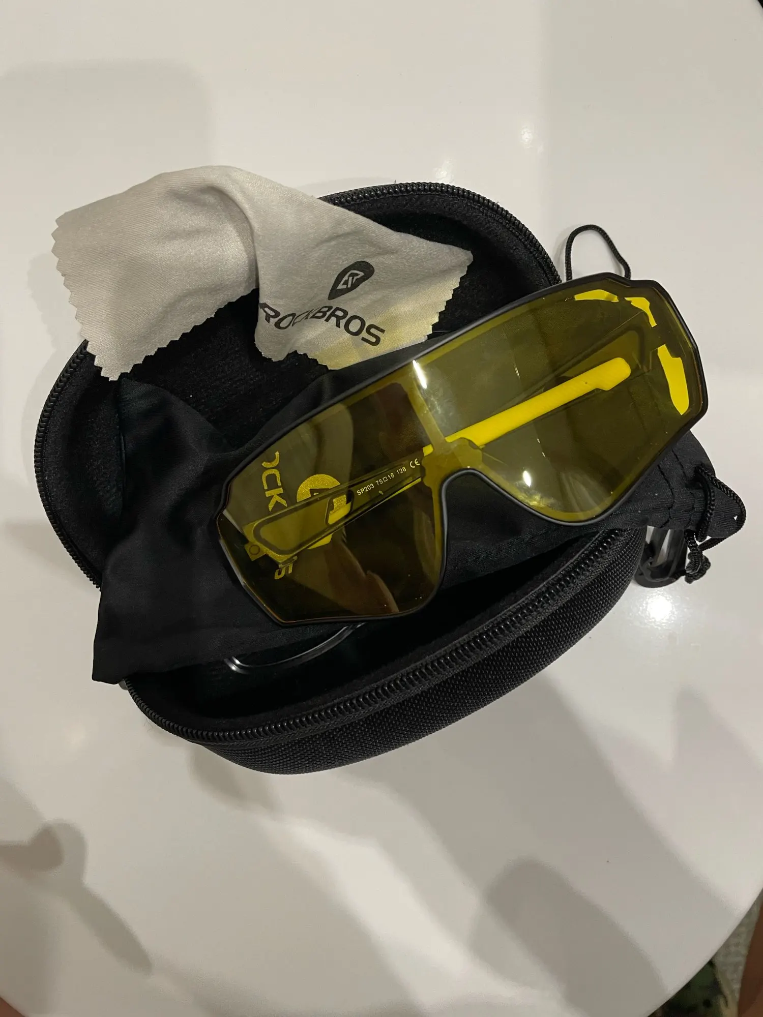 Доставка из России до двери очень быстро , упаковано хорошо . Обычные пластиковые очки , только фотохромные - здесь цена в основном за футляр и остальные аксессуары . Очки быстро темнеют под ультра-фиолетовой лампой и темнеют на солнце и даже немного при облачной погоде . От попадания насекомых наверное защищают - от ветра почти нет , но у меня электро велосипед и скорость 30-40 км/час .