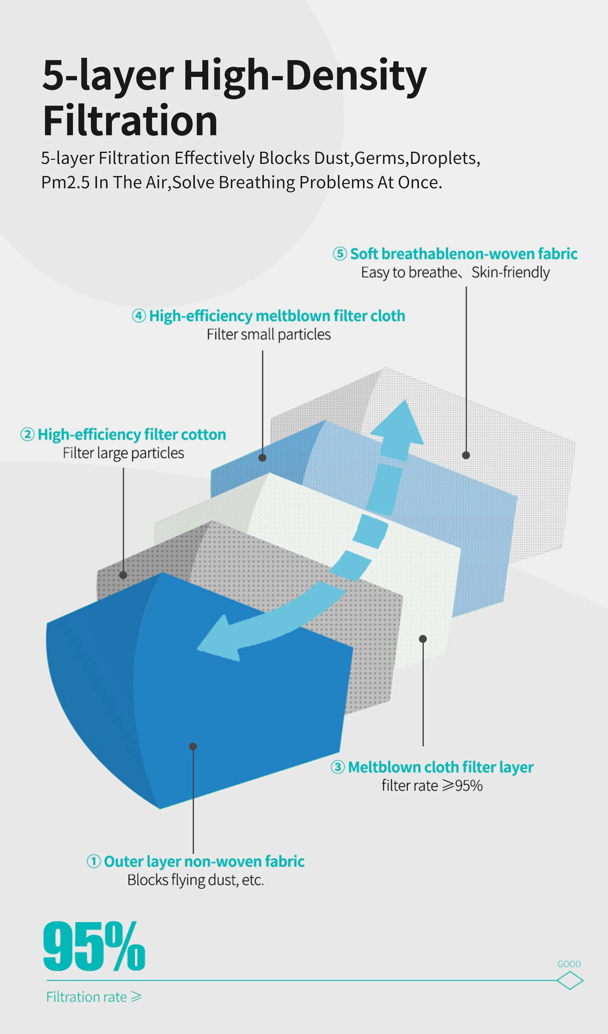 Маска может изолировать мелкие частицы и плотно прилегает к лицу, ее нелегко пропускать воздух с периферии, а эффективность фильтрации твердых частиц может достигать 95% при стандартных условиях.