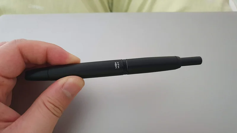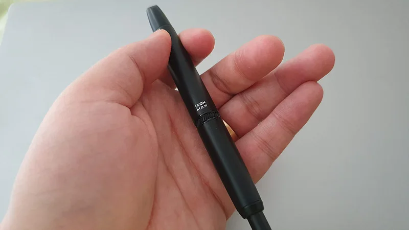 Матовый черный без зажима имеет немного разную матовую текстуру на разных частях. Щелкающие части довольно длинные, когда перо скрыто. Очень удобно писать.