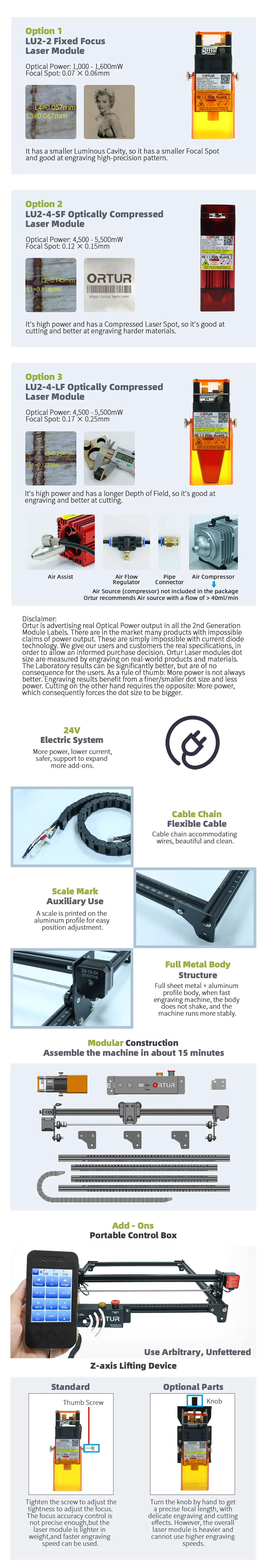 Бренд: OrturНомер модели: Laser Master 2 pro S2Тип: лазерная гравировальная машинаМатериал: алюминий + сталь с порошковым покрытиемМощность лазера: LU2-4 лазерный модуль с сжатым фокусным расстоянием 20 Вт (электрическая мощность: 20 Вт, Сила света: 5000-5500 МВт)Дальность достижения лазера: 445 ± 5 нмПитание: адаптер питания 24 В 2 А