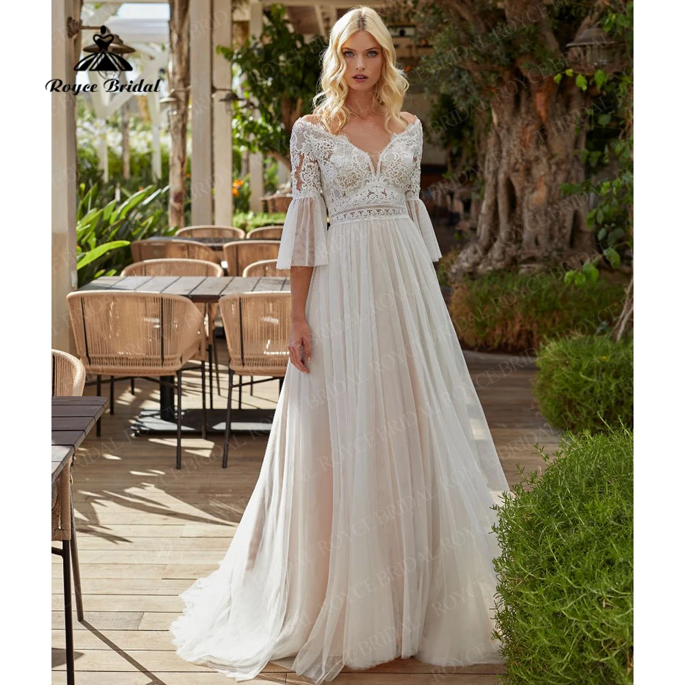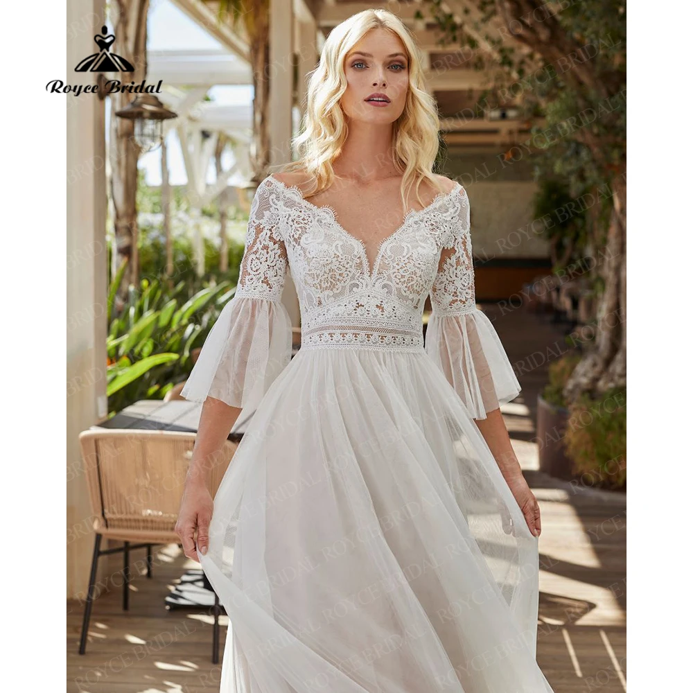 Винтажное пляжное свадебное платье из тюля с рукавами-колоколами, элегантное богемное кружевное свадебное платье с V-образным вырезом