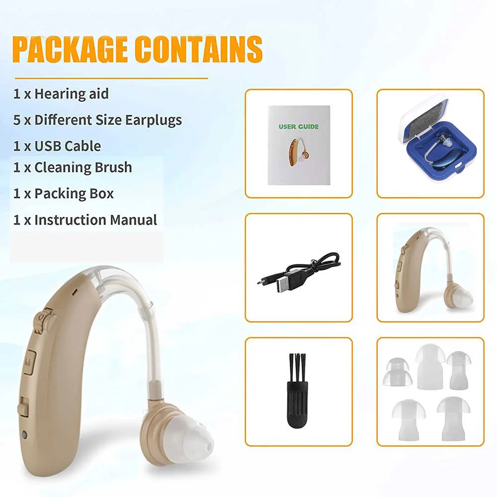 Мини-слуховые аппараты Bluetooth, перезаряжаемый BTE-аудиофон, усилитель звука для глухих, шумоподавление, регулировка громкости, защита от потери