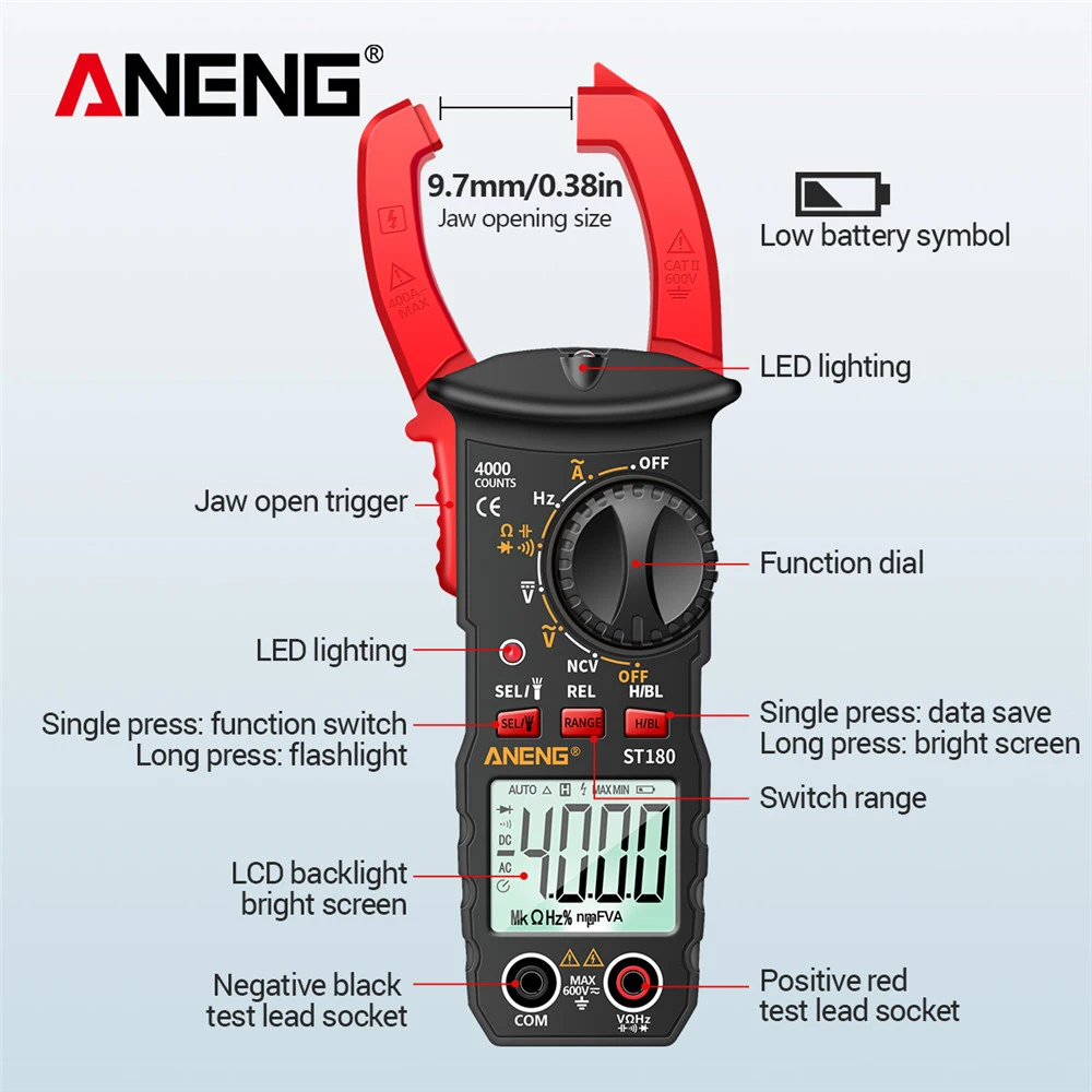 Цифровой мультиметр-зажим ANENG ST180, 4000 отсчетов, мультиметр переменного тока, амперметр, тестер напряжения, автомобильный тестер емкости и бесконтактного напряжения, инструмент
