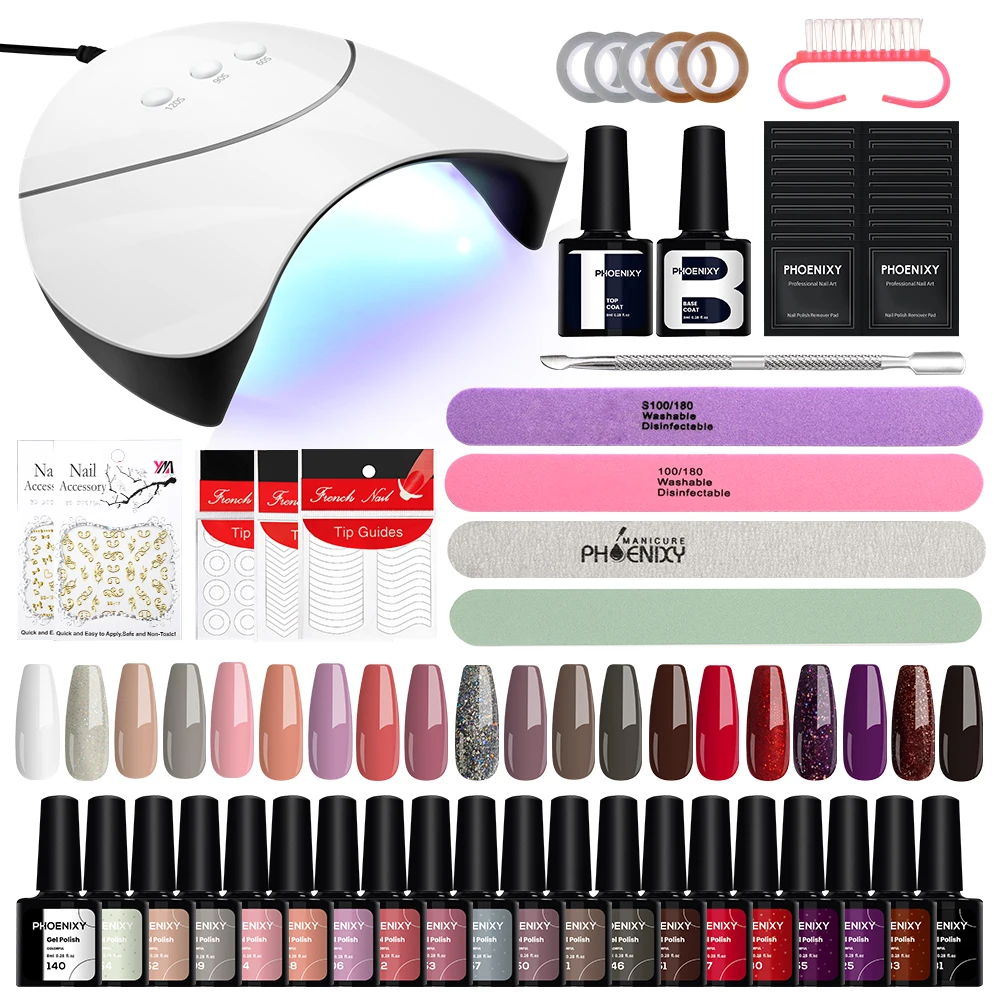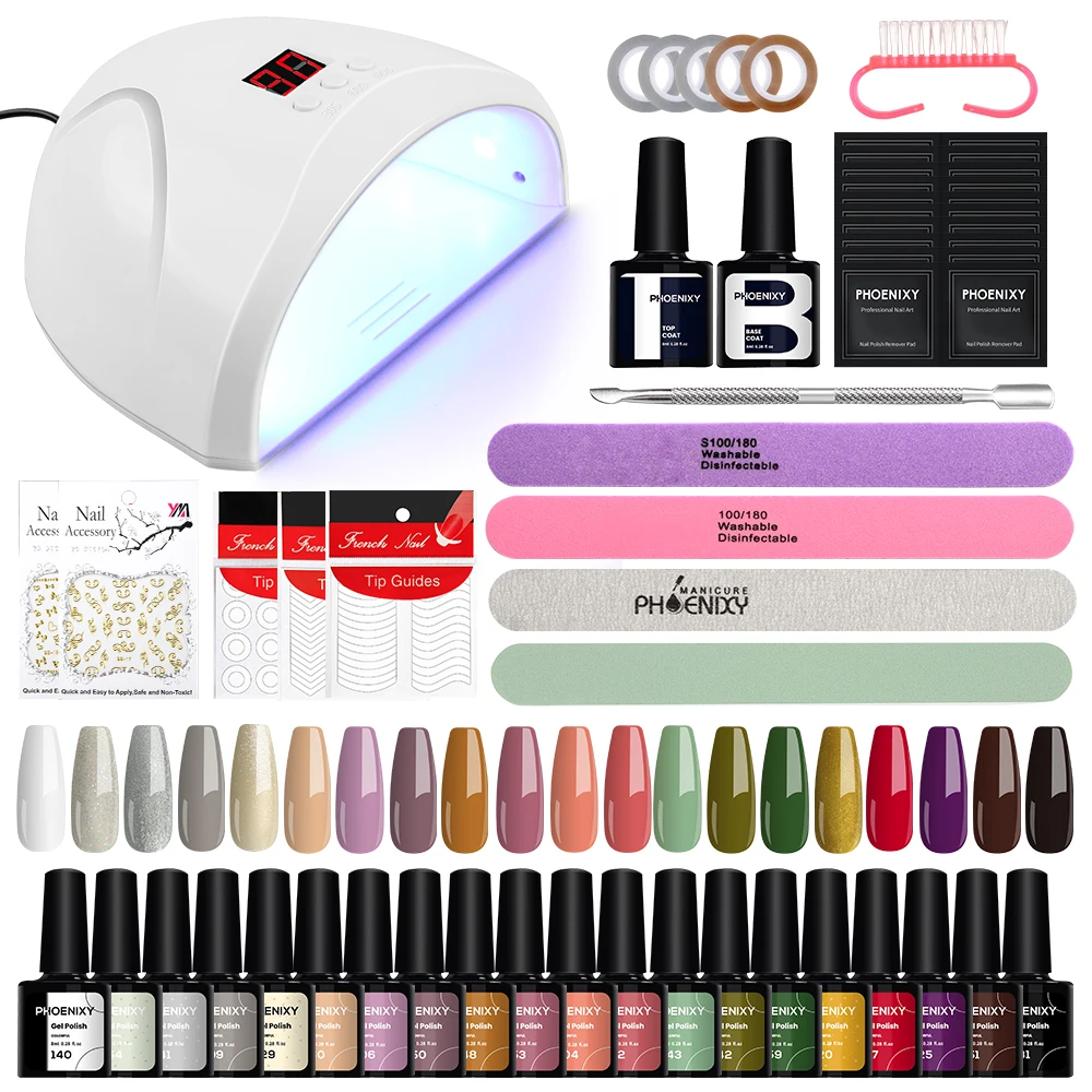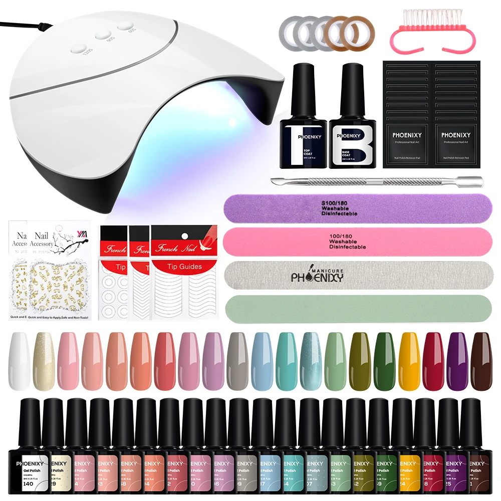 1X36W УФ светодиодный светильник20X8 мл Гель-лак для ногтей1 базовое пальто 8 мл1 х 8 мл верхнее пальто3 X наклейка для ногтей для французского маникюра1 X толкатель для ногтей1 х фиолетовая губка для ногтей1 X розовая губка для ногтей1 х серая пилка для ногтей1 х Шлифовальная Пилка Для Ногтей20 X средство для удаления ногтей2 х металлические наклейки для ногтей5 X лента для ногтей1 X щетка для ногтей