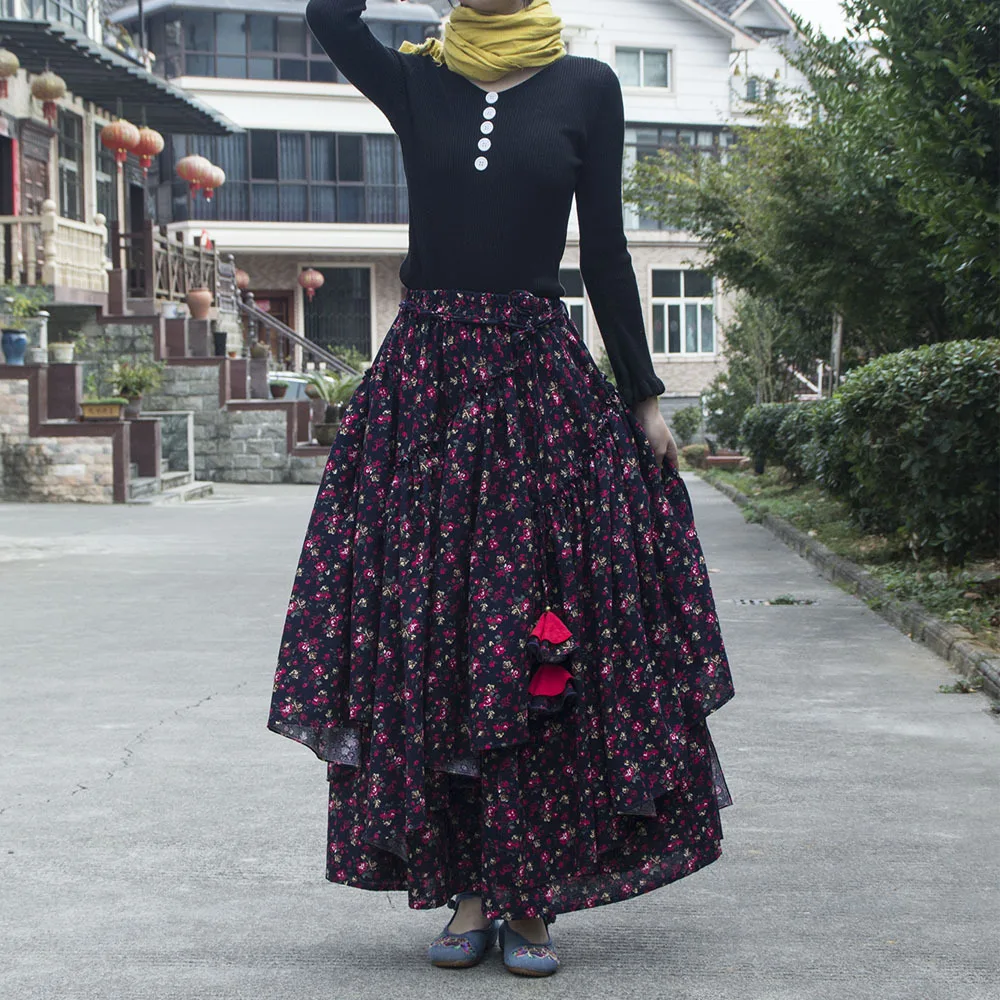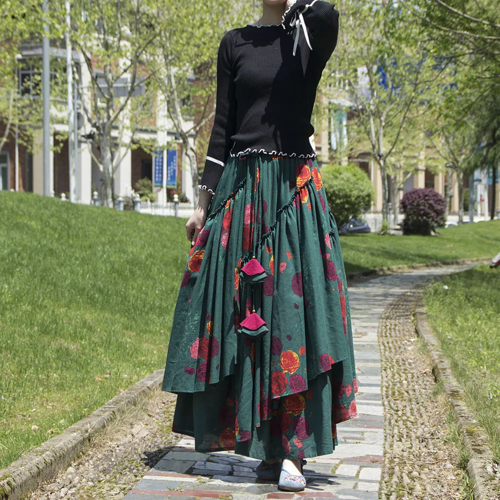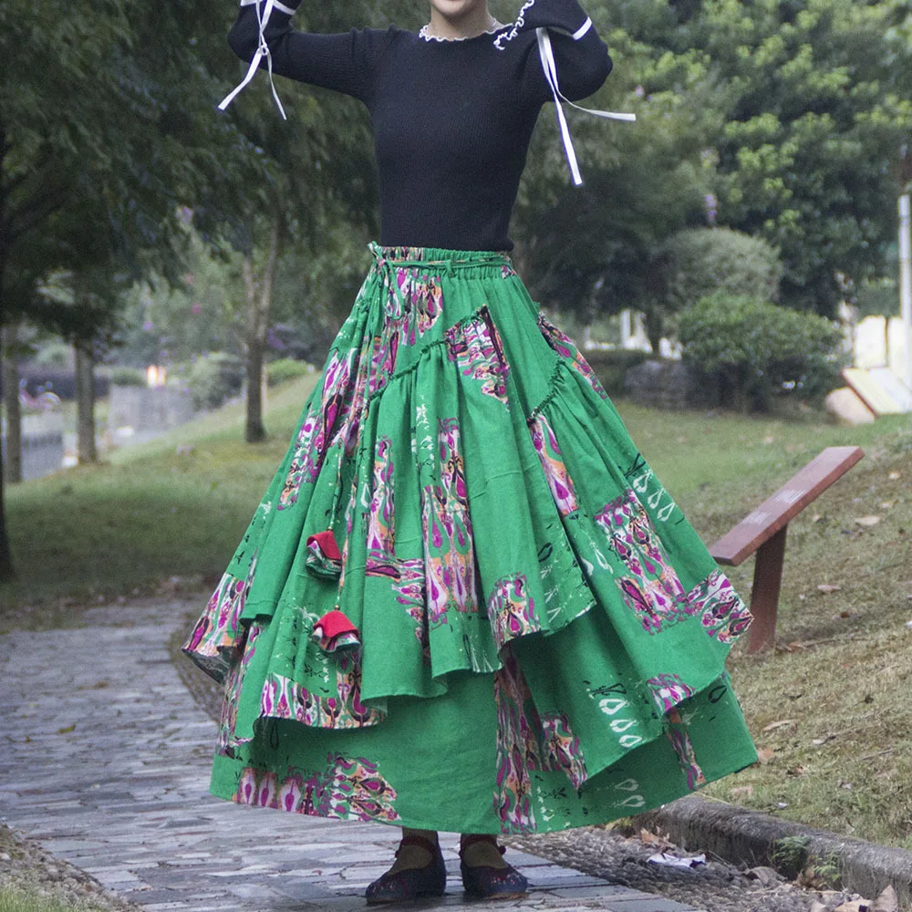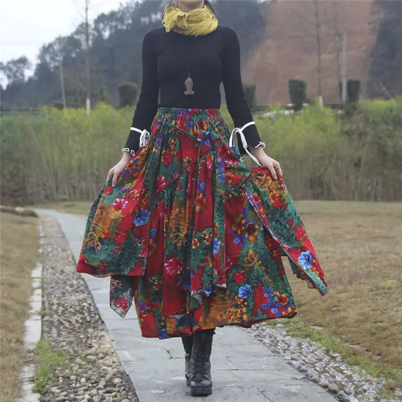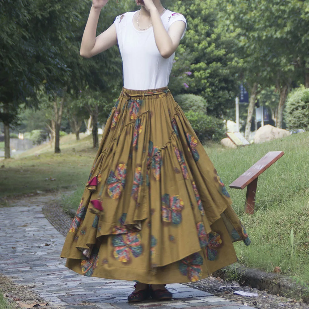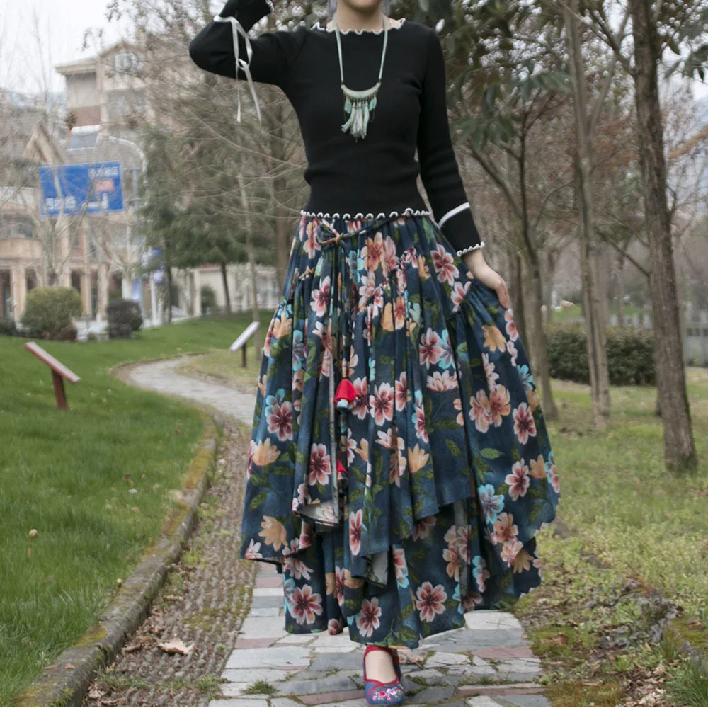 Юбка-макси Женская в этническом стиле, длинная ассиметричная юбка из хлопка и льна с цветочным принтом, с поясом на резинке, в ретро стиле, весна