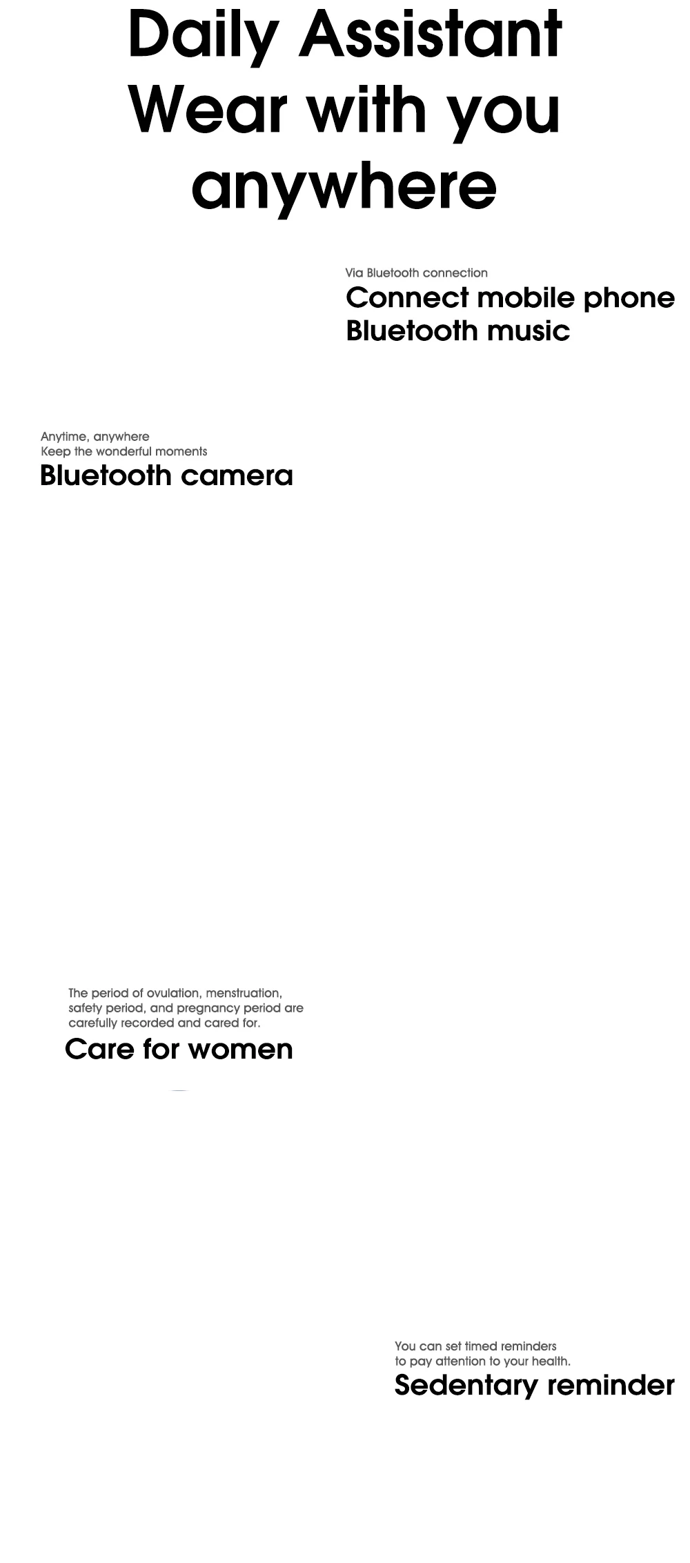 Пункты продажи: IP68 водонепроницаемый, 1,81 дюймовый дисплей, низкое потребление двойного режима Bluetooth, SiriОсновные характеристики: загрузка Watchface, Разделенный экран, блокировка доступа, вызов Bluetooth, частота сердечных сокращений, BP, ECG, запись периода для женщин.