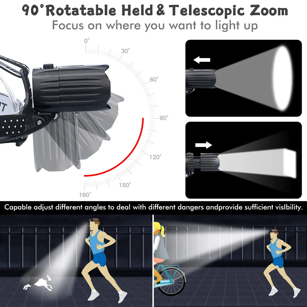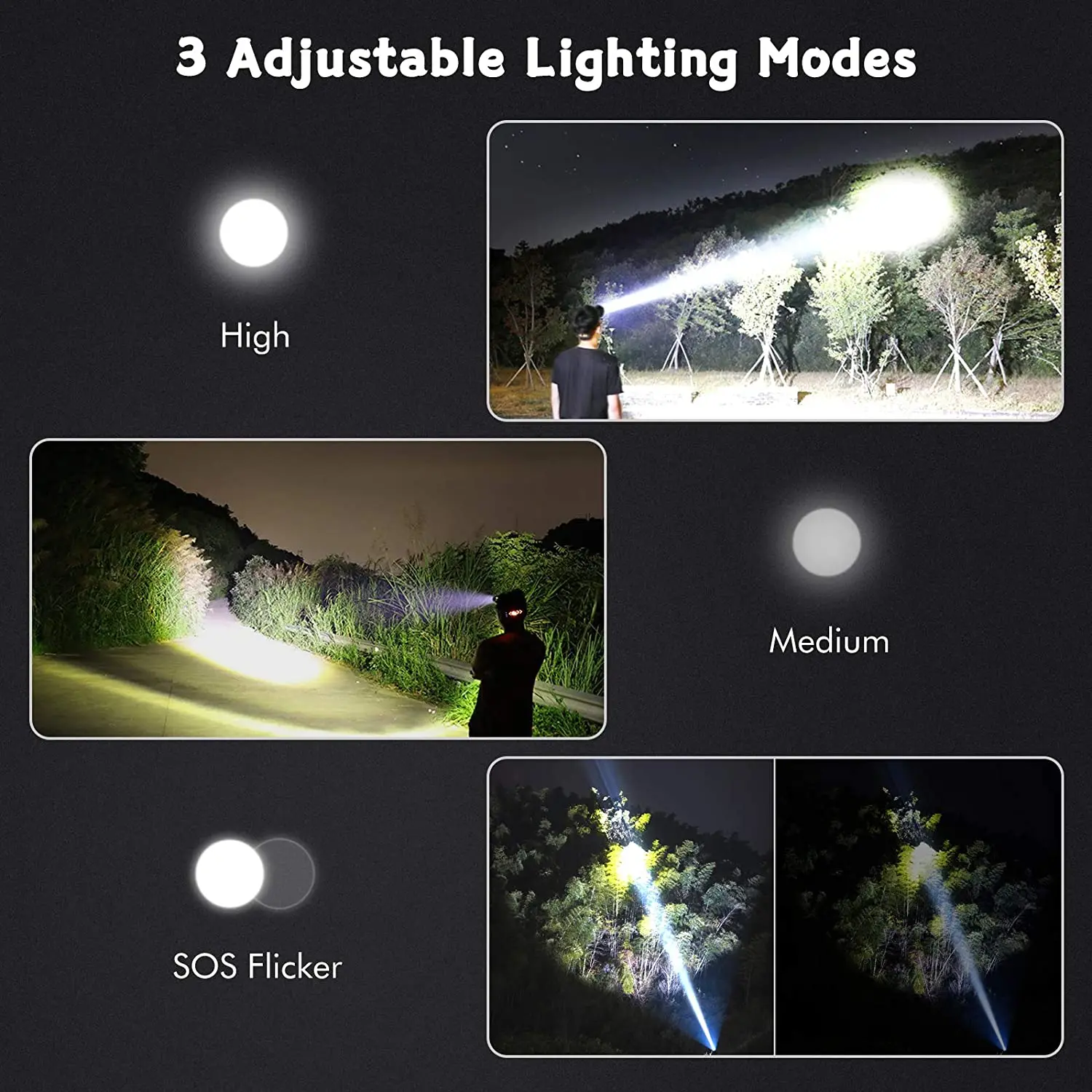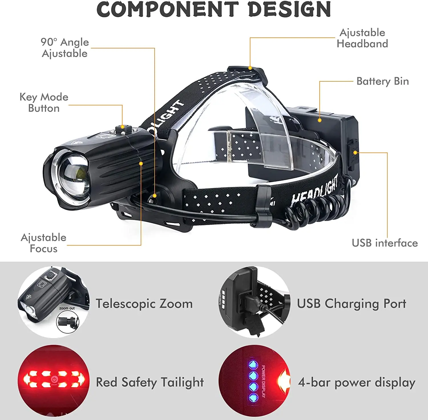 -- Светодиодный перезаряжаемый налобный фонарь, встроенный светодиодный чип XHP90.2 для максимальной выходной мощности до 10000 люмен, обеспечивает вам диапазон яркости до 1320 футов (400 метров), позволяет четко видеть окружающую среду, позволяя вам свободно работать, читать и исследовать, когда и где вы хотите.