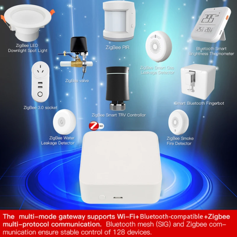 Многопротокол связи. Bluetooth mesh ( SIG) и Zigbee com -munication обеспечивают стабильное управление 128 устройствами