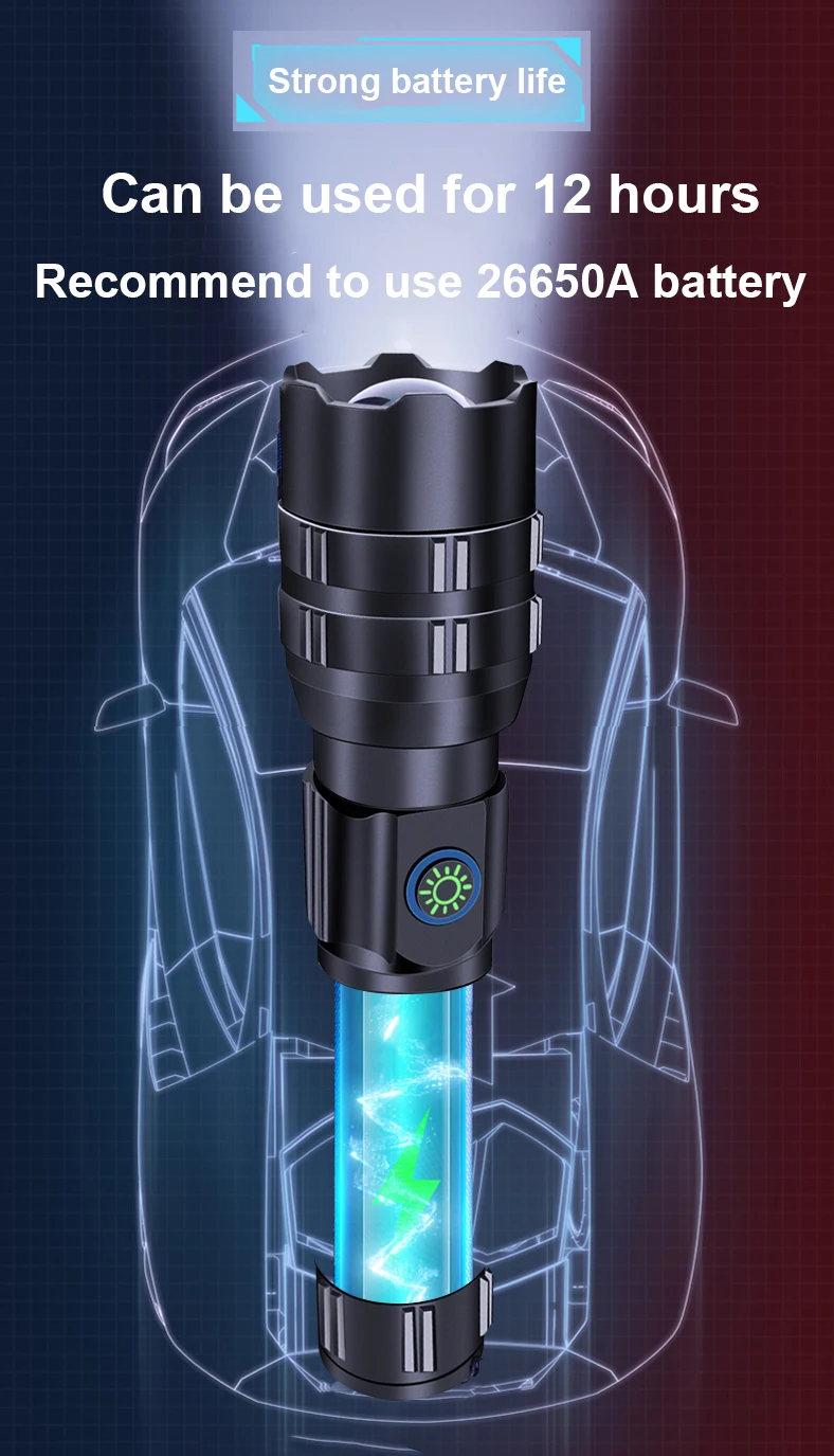 XHP199 параметры фонарика• Модель светодиодный бусины: XHP199 светодиодный• Размеры: 18 см * 4,3 см * 3,5 см• Материал: авиационный алюминиевый сплав• Режимы переключения: 5 режимов (High - Medium - Low - Strobe - SOS)• Световой диапазон: 800-1500 м• Цвет излучения: белый светильник• Водонепроницаемость: IPX-8• Батарея: 18650 или 26650• Зарядное устройство: зарядное устройство USB Type-C• Время зарядки: 6 часов• Время освещения: 4-10 часов• Дисплей аккумулятора: Да• Функция внешнего аккумулятора: может быстро зарядить телефон
