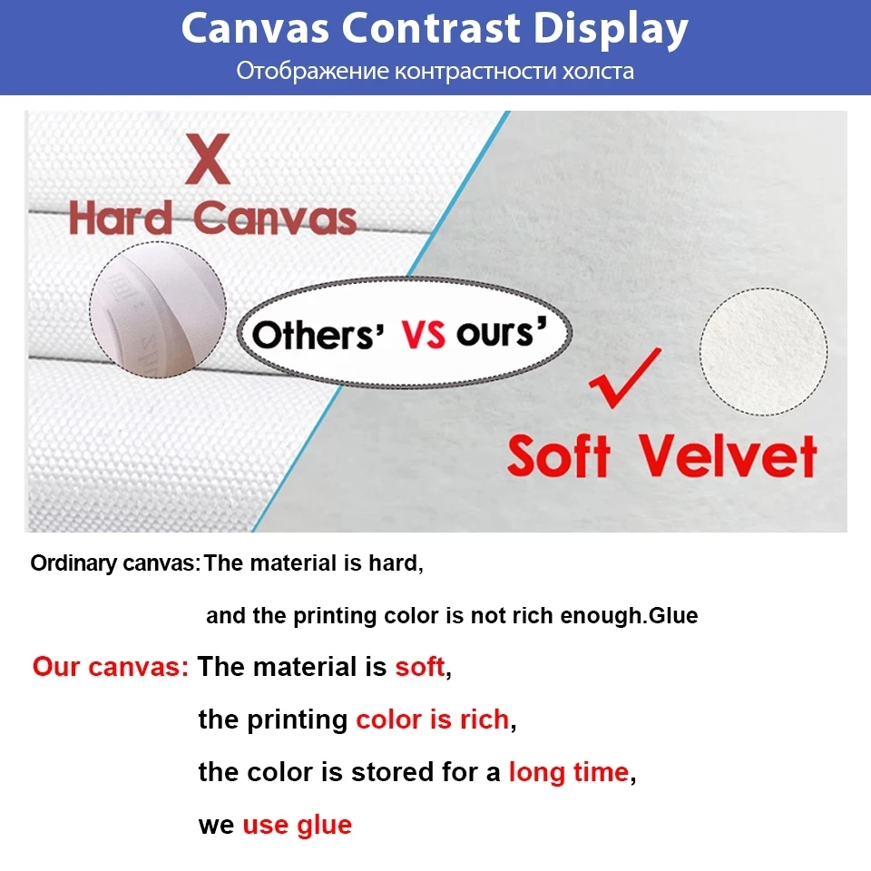 Обычный холст:Материал жесткий, а цвет печати недостаточно насыщенный.Приклейте наш холст:Материал мягкий, цвет печати богатый, цвет хранится в течение длительного времени мы используем клей