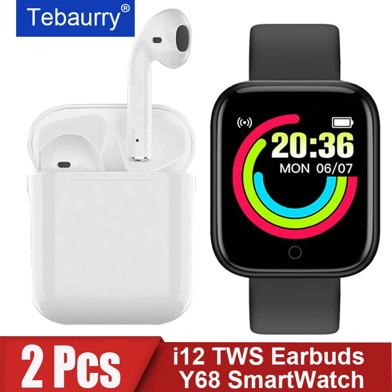 2 шт. D20 i12 TWS bluetooth наушники умные часы мужские и женские Bluetooth цифровые часы спортивные FitnessTracker шагомер Y68 умные часы для Android Ios