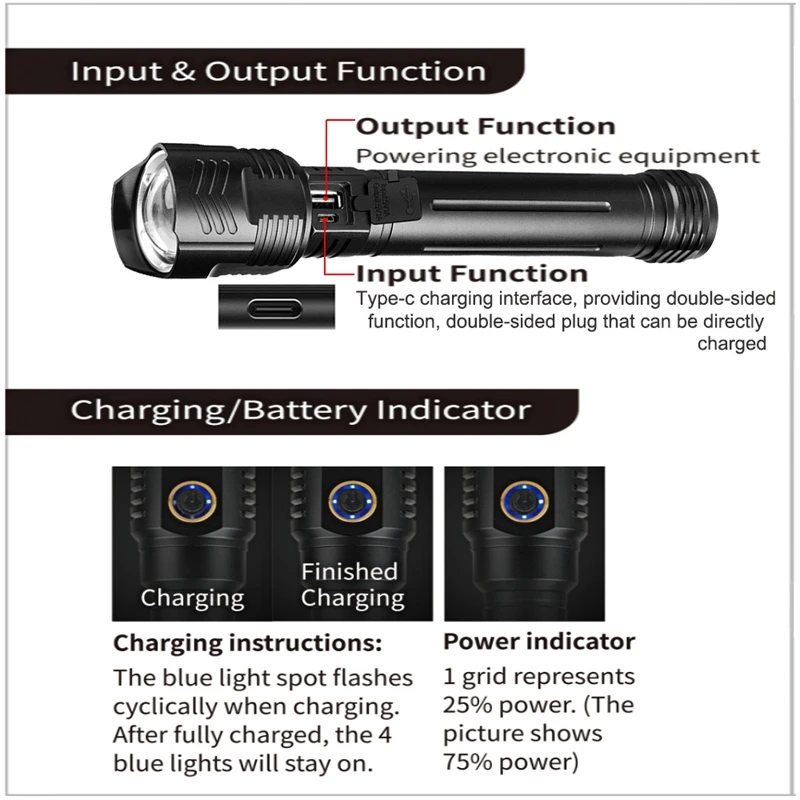 [Характеристики]: Новая быстрая зарядка через USB Type-c, функция отображения заряда батареи, функция увеличения выходного сигнала, может использоваться в качестве внешнего аккумулятора для зарядки мобильных телефонов, увеличенных линз, Более широкий диапазон освещения, дополнительная функция молотка безопасности на хвосте, используется для аварийного выхода, трубка добавляет силикагель к телу, противоскользящий и противоскользящий1,16 Основная лампа бисер, высокая яркость, фактически может достигать 3000 люмен, таким образом, и эти советы помогут продлить срок службы изделия составляет 100000 часов;2. Выпуклая линза: большая выпуклая линза Eagle eye, выпуклая линза, хороший светильник, производительность передачи, не легко повредить, прочная алюминиевая ударная головка для защиты объектива от износа3. Телескопический зум: растяните голову влево и вправо, чтобы увеличить, режим астигматизма-концентрации, удобный для использования в различных ситуациях;4. Средний переключатель: высококачественный натуральный резиновый материал, нескользящая обработка поверхности, светильник, нажмите переключатель, чтобы переключить светильник; Контакт батареи: контактная конструкция с пружиной батареи имеет хорошую электропроводность и эффективно предотвращает плохой контакт.[Рабочая передача]: 5 передач (сильный, средний, слабый, быстрый мигание, медленное мигание)[Применимый аккумулятор]: 26650x 2/18650x2 (без аккумулятора)[Водонепроницаемость]: IPX6 (водонепроницаемость, защита от дождя)[Люмен]: (фактически около 3000 люменов)[Мощность продукта]: 30 Вт[Рабочее напряжение]: 7,4 В[Можно осуществлять прямую зарядку]: TYPE-C прямое Зарядное устройство USB (с выходом и двумя входными интерфейсами)[Фокусировка]: Телескопический фокус[Положение переключателя]: Средний кнопочный переключатель[Дисплей питания]: переключатель с функцией отображения мощности, 4 Светодиодный индикатор, каждый светильник составляет 25% мощностиМатериал: алюминиевый сплавЦвет: черныйПосылка:Фонарик-1 шт.1 х USB кабель для передачи данныхТолько вышеуказанная посылка, другие товары не включены.Примечание: светильник и различные дисплеи могут привести к тому, что цвет товара на картинке немного отличается от реального. Допускается погрешность в измерениях +/- 1-3 см.