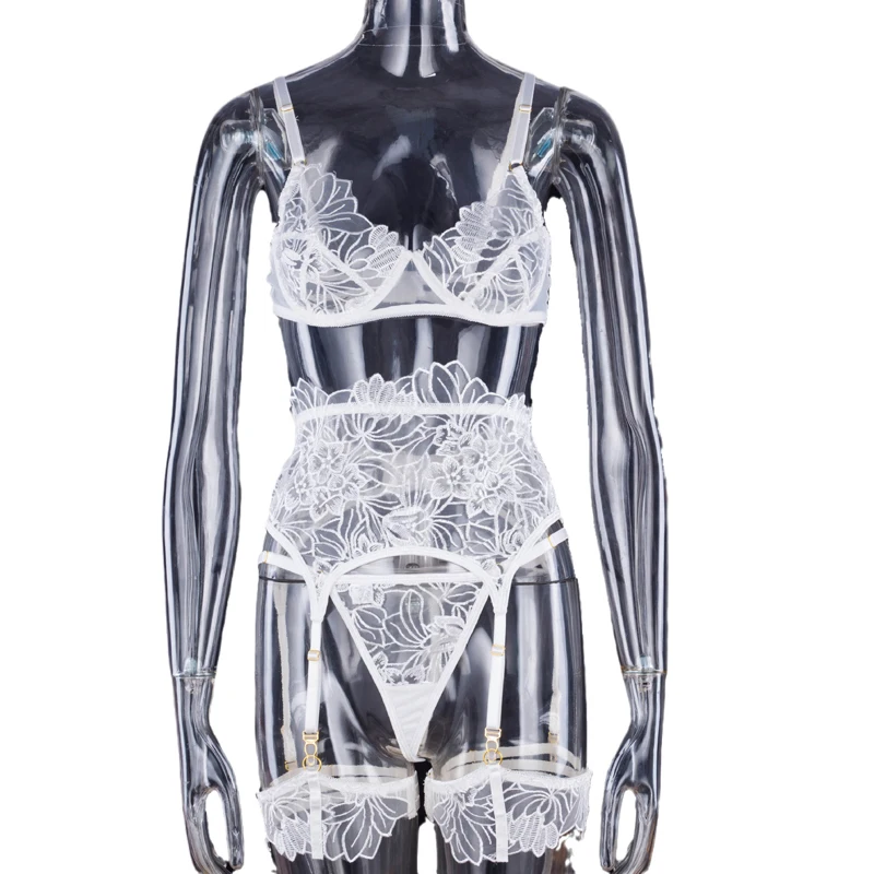 Прозрачное эротическое белье, женское сексуальное нижнее белье, комплект с подвязками, Белый Свадебный бюстгальтер с вышивкой, бюстгальтер и трусики