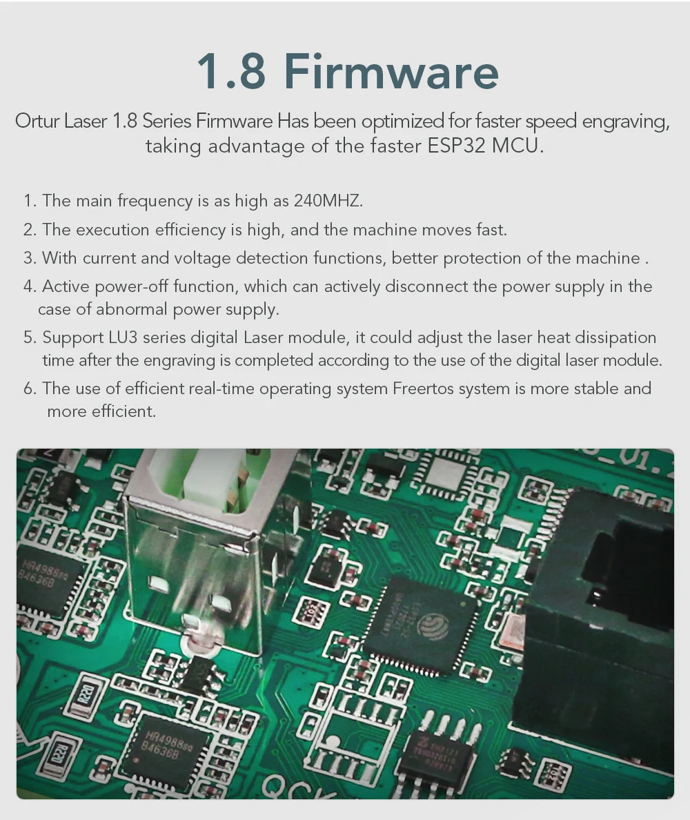 [Преимущество продукта] Ortur Laser 1,8 прошивка, квалифицированная для ESP32 MCU, оптимизирует алгоритм движения и увеличивает максимальную скорость шагового двигателя до макс. 5000 мм/мм.