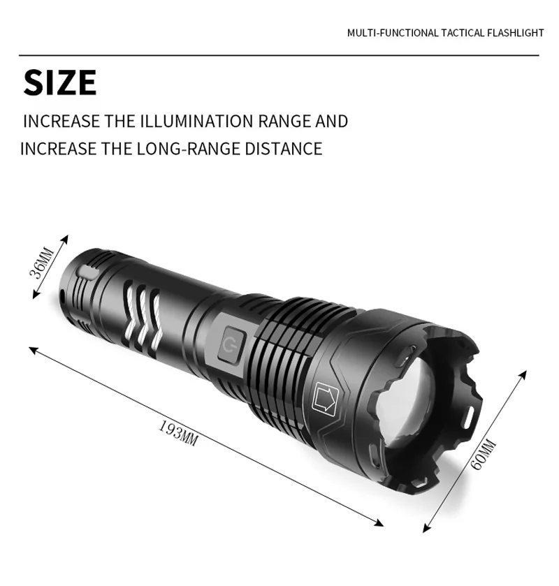 • Бренд: TRLIFE• Модель светодиодный бусины: XHP199• Лампочка/светодиодный срок службы:> 100000 часов• Диапазон: 1200 метров• Режим масштабирования: телескопический зум• Режим переключения: 5 режимов (High - Medium - Low - SOS - Flash)• Тип батареи: 26650 или 18650• Время освещения: 10 часов (26650)• Функция внешнего аккумулятора: Да• Уровень водонепроницаемости: IPX-6• Цвет корпуса: черный• Материал: T6063-T6 авиационный алюминий• Размеры: 20 см * 8,2 см * 3,5 см• Фонарь Вес нетто: 0,382 кг• Перезаряжаемый: микро-usb для компьютера, usb для автомобиля, usb-разъем для зарядки• Тип фонарика: охота, патрулирование, техническое обслуживание, работа, поиск и спасение