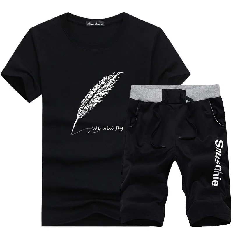 Костюм спортивный мужской из 2 предметов, однотонный спортивный Гавайский костюм, футболка с коротким рукавом и шорты, Повседневная модная одежда с принтом перьев, лето