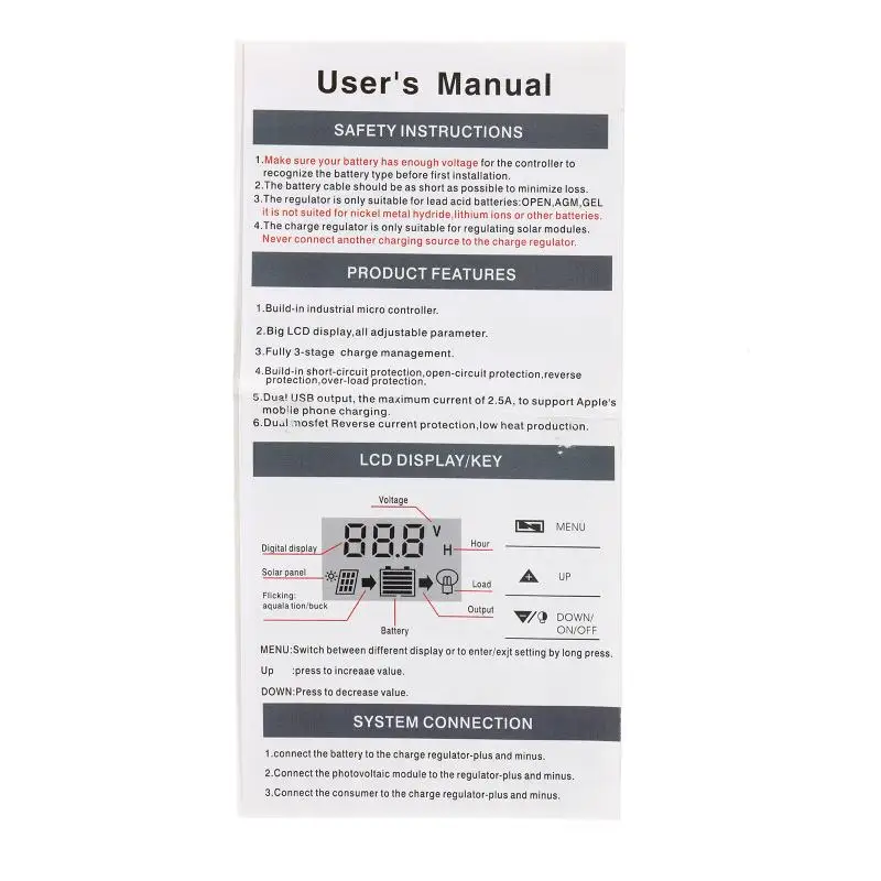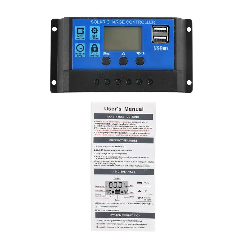 Особенности: 1. При использовании солнечного контроллера для зарядки аккумулятора контроллер автоматически проверяет напряжение. 2. При переносе положительных и отрицательных зарядов на контроллер, не обращайте вспять. 3. Подключите солнечную панель к солнечному контроллеру. Примечание: строго соблюдайте солнечные панели и солнечные контроллеры. В противном случае Солнечный контроллер может быть поврежден. Спецификация: Название: Солнечный контроллер Материал: ПВХ Напряжение: 12 В/24 В Автоматическая идентификация Номинальный ток зарядки: 60A/50A/40A/30A/20A/10A Номинальный ток разряда: 20A/10A Наивысшее фотоэлектрическое напряжение: 12 В система <25 В/24 В система <50 в Выход USB: 2 выхода USB, максимум 5 В/2 А Ток в режиме ожидания: <10 мА Рабочая температура: -35 ℃ ~ + 60 ℃ Сертификация: CE RoHS Размер: 180*90*45 мм Цвет: как показано Упаковка включает: 1 x Солнечный контроллер Примечание: 1. Возможны незначительные отклонения в размере на 1-3 см (0,4-1,18 ") измерения выполнены вручную, допускаются отклонения в размере в пределах и небольшое отличие в цвете может незначительно отличаться из-за разных настроек экрана. 2. В связи с использованием разных по светильник экране монитора фактический цвет товар точно такой же, как и цвет изделия на фото может быть s светильник ly отличается из-за характеристик монитора компьютера. Пожалуйста, поймите.