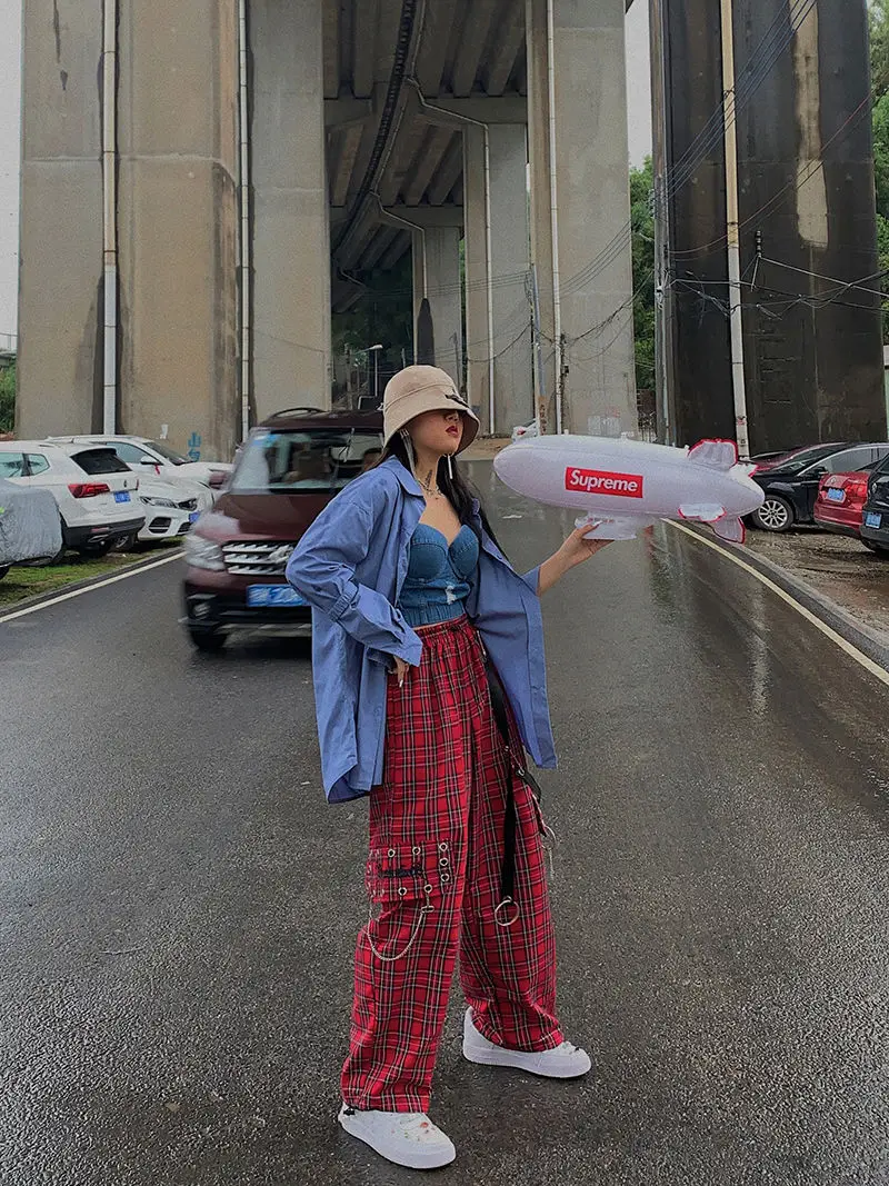 Брюки-карго женские в клетку, красные широкие брюки в стиле панк, в стиле хип-хоп, в корейском и японском стиле Joggy