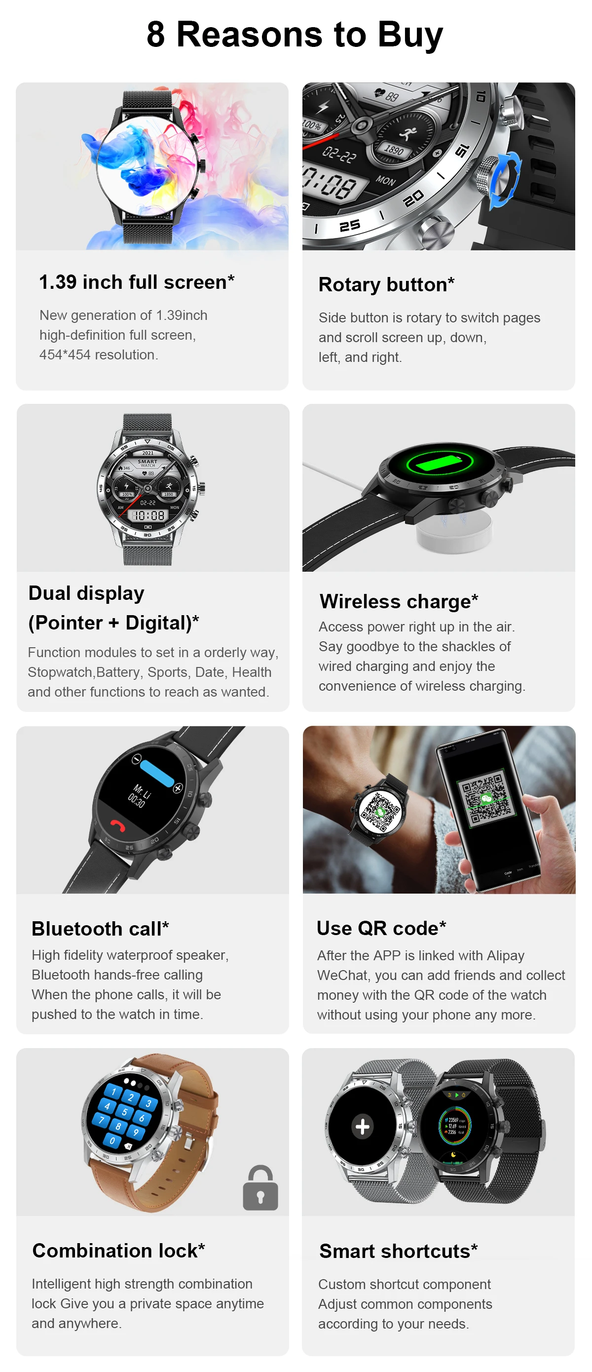 * Версия Bluetooth: 4,2 + 5,0 двойной режим* Совместимые ОС: Android 5,0 или выше, iOS 9,0 или выше* Режим работы: Полный сенсорный экран* Размер сенсорного экрана: 1,39 дюймов IPS цветной экран 454*454 пикселей* Тип зарядки: 2pin Магнитная Зарядка* Время зарядки: около 2 часов* Время использования: около 1 дня* Емкость аккумулятора: 280 мАч